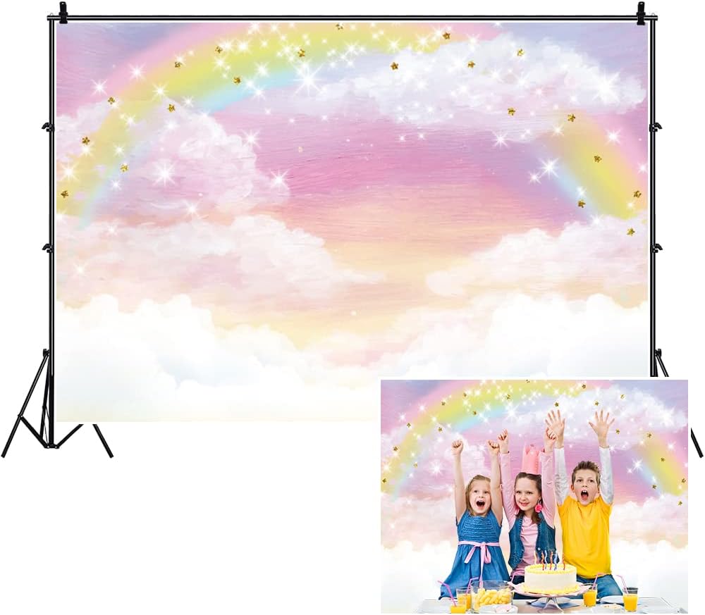 Renaiss 3x2.5m Regenbogen Himmel Hintergrund Wolke Glitzer Sterne Rosa Himmel Süsse Fotografie Hinte