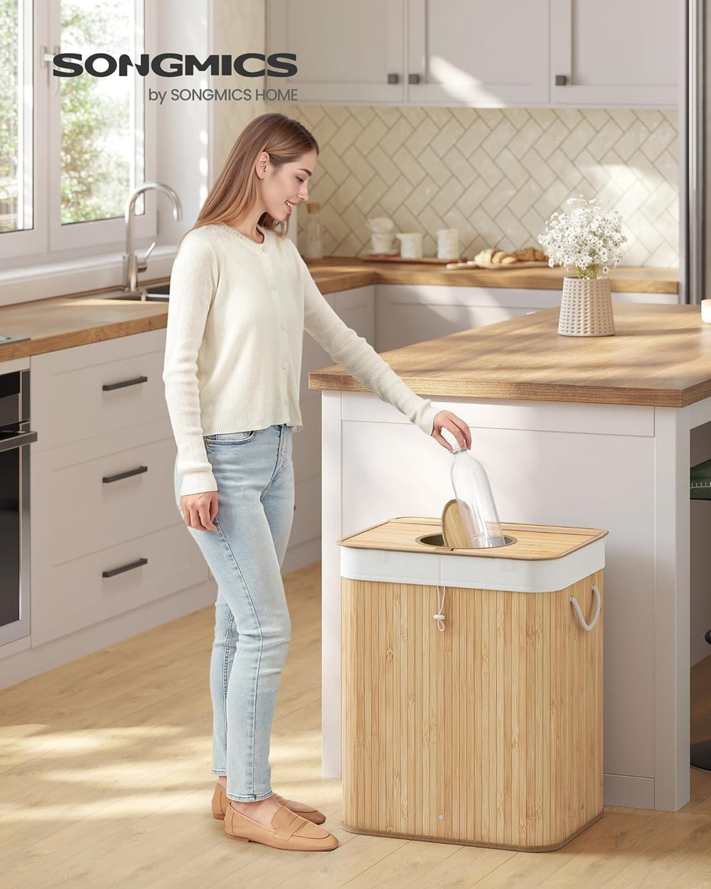 SONGMICS Pfandflaschen-Sammelbehälter, 95 L Pfandflaschen-Behälter, Bambus, Flaschensammler Leergut,