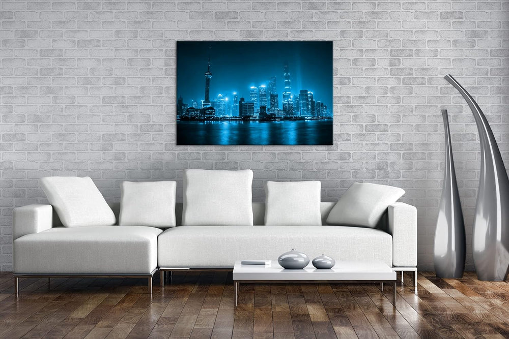 deyoli atemberaubende Shanghai Skyline Format 80x60 Effekt: Monocrome Blau als Leinwandbild, Motiv f