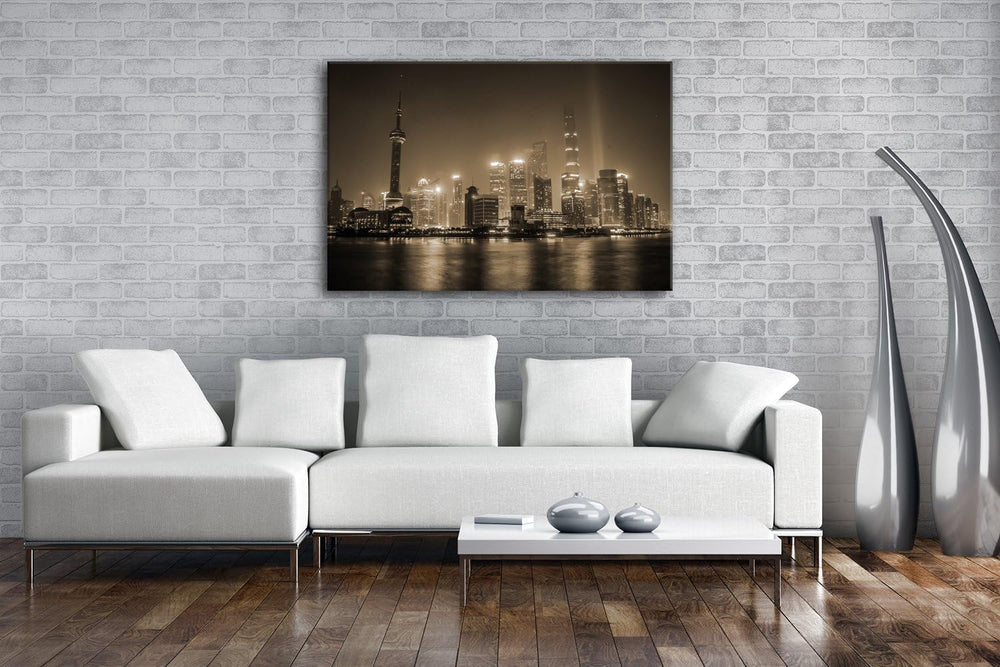 deyoli atemberaubende Shanghai Skyline Format: 80x60 Effekt: Sepia als Leinwandbild, Motiv fertig ge