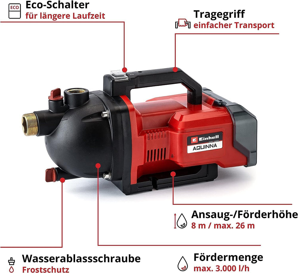 Einhell AQUINNA 36/30 Akku-Gartenpumpe Power X-Change (2 x 18V, 2-Stufen ECO-Schalter, Wassereinfüll