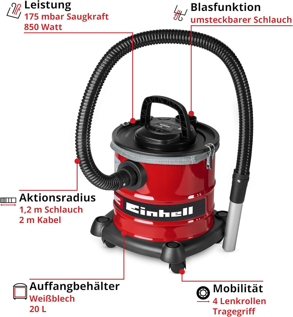 Einhell Aschesauger TC-AV 2032 DW (850 W, 175 mbar Saugleistung, 20 L Auffangbehälter, Faltenfilter,