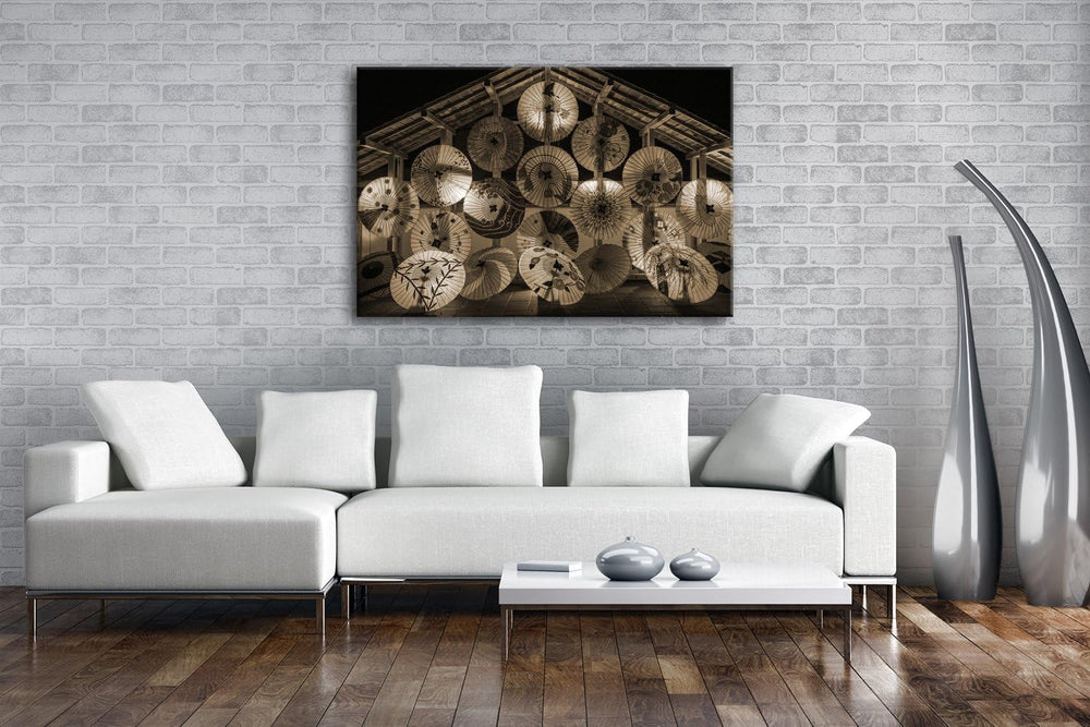 deyoli viele bunte japanische Regenschirme Format: 80x60 Effekt: Sepia als Leinwandbild, Motiv ferti