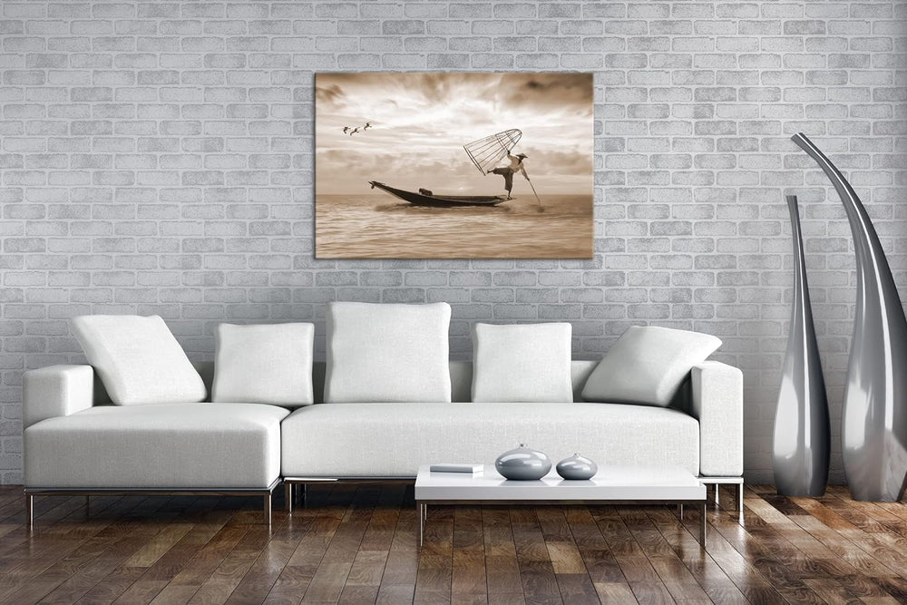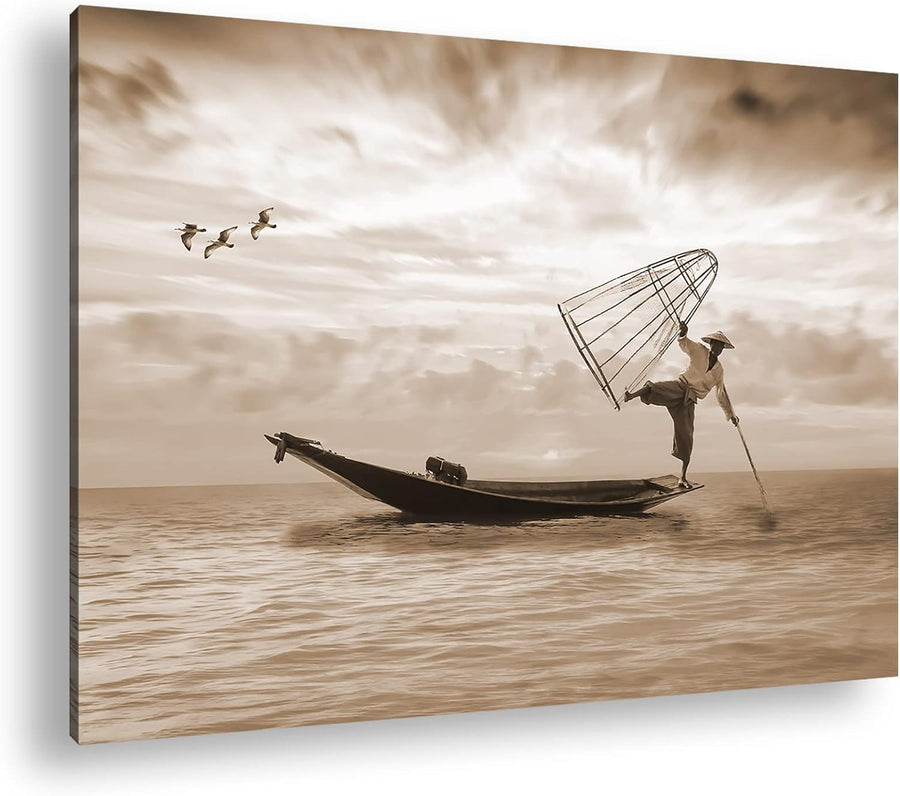 deyoli verspielter Fischer auf seinem Boot Effekt: Sepia Format: 120x80 als Leinwandbild, Motiv fert
