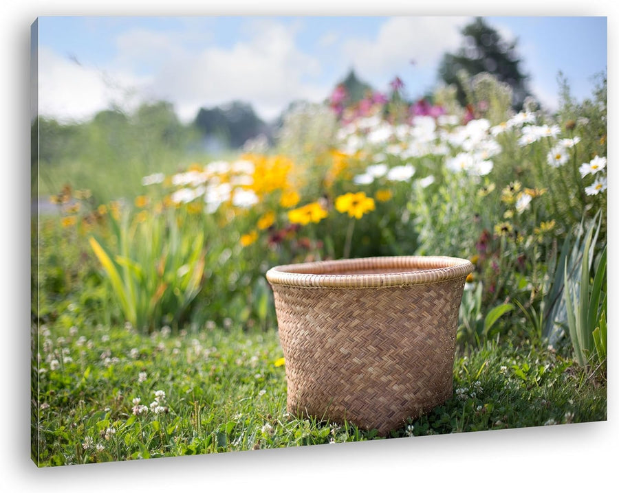 deyoli Weidenkorb am Blumenbett Format: 100x70 als Leinwand, Motiv fertig gerahmt auf Echtholzrahmen