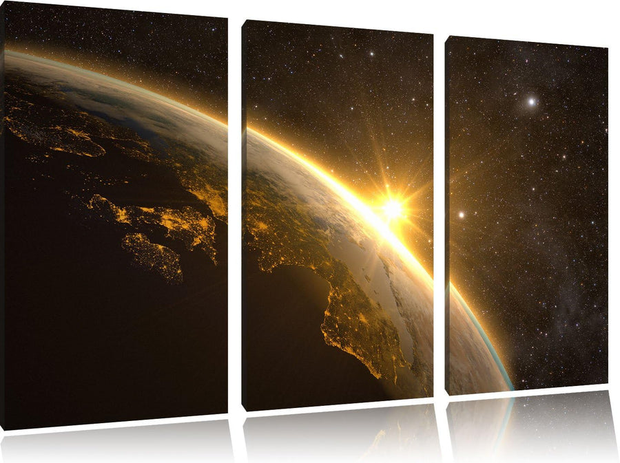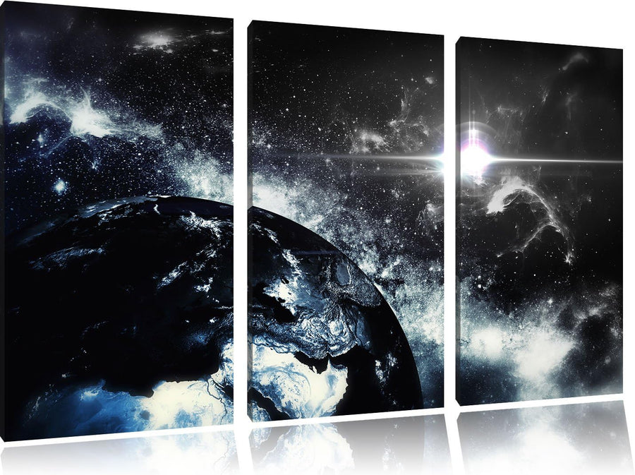 Pixxprint Die Sonne und Erde im Weltall / 3-Teilig/Gesamtmass 120cm Leinwandbild bespannt auf Holzra