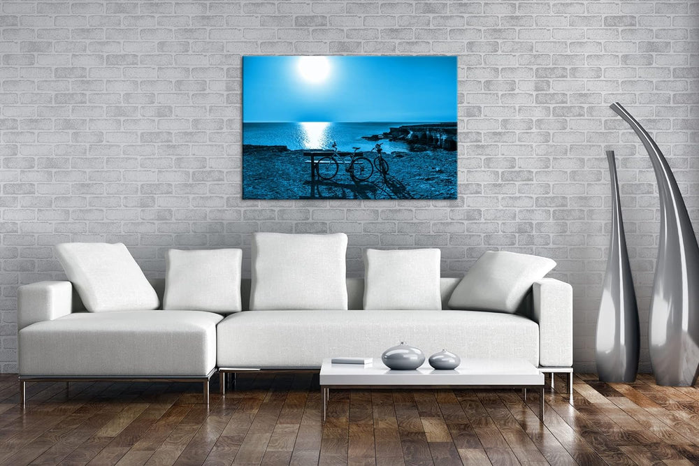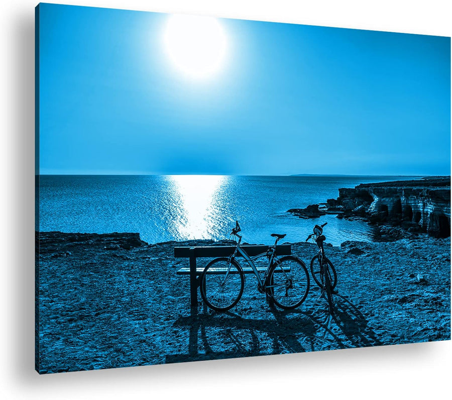 Fahrrad Tour an der Küste Format: 80x60 Effekt: Monocrome Blau als Leinwand, Motiv fertig gerahmt au