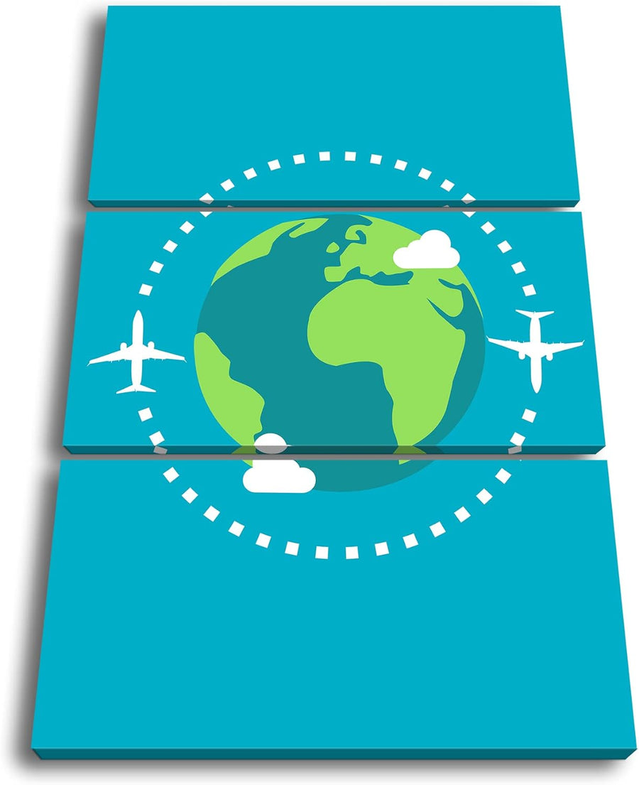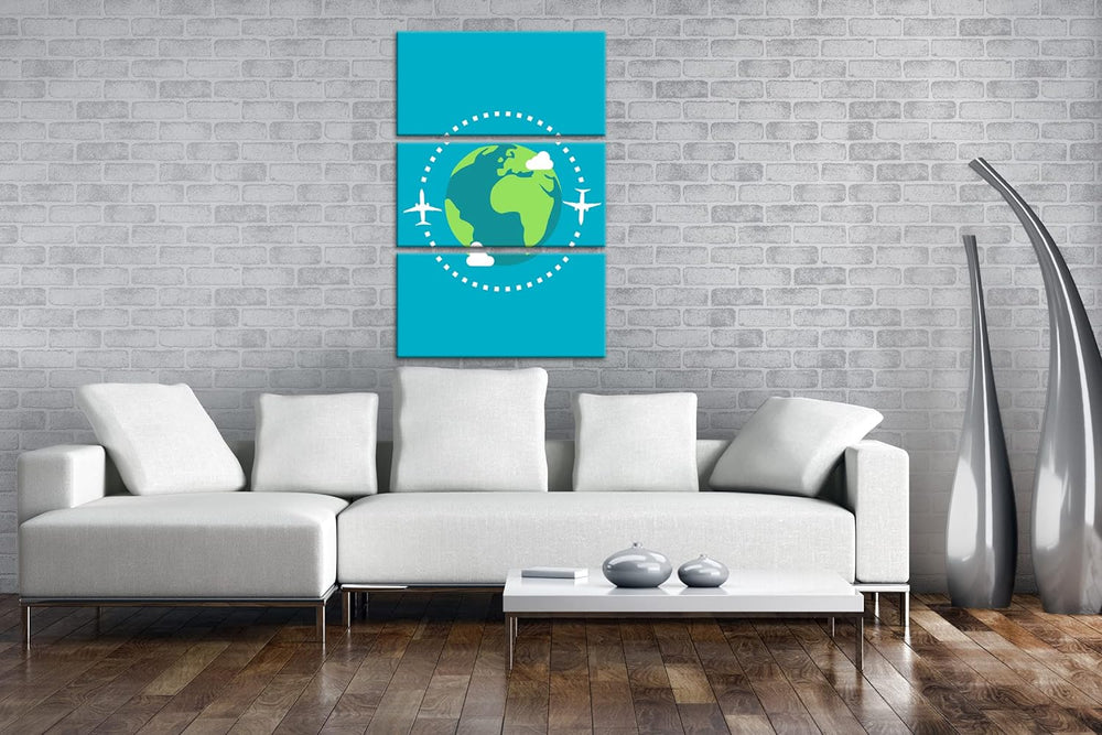 Flugzeug um die Erde Logo Format: 3Teilig als Leinwandbild, Motiv fertig gerahmt auf Echtholzrahmen,