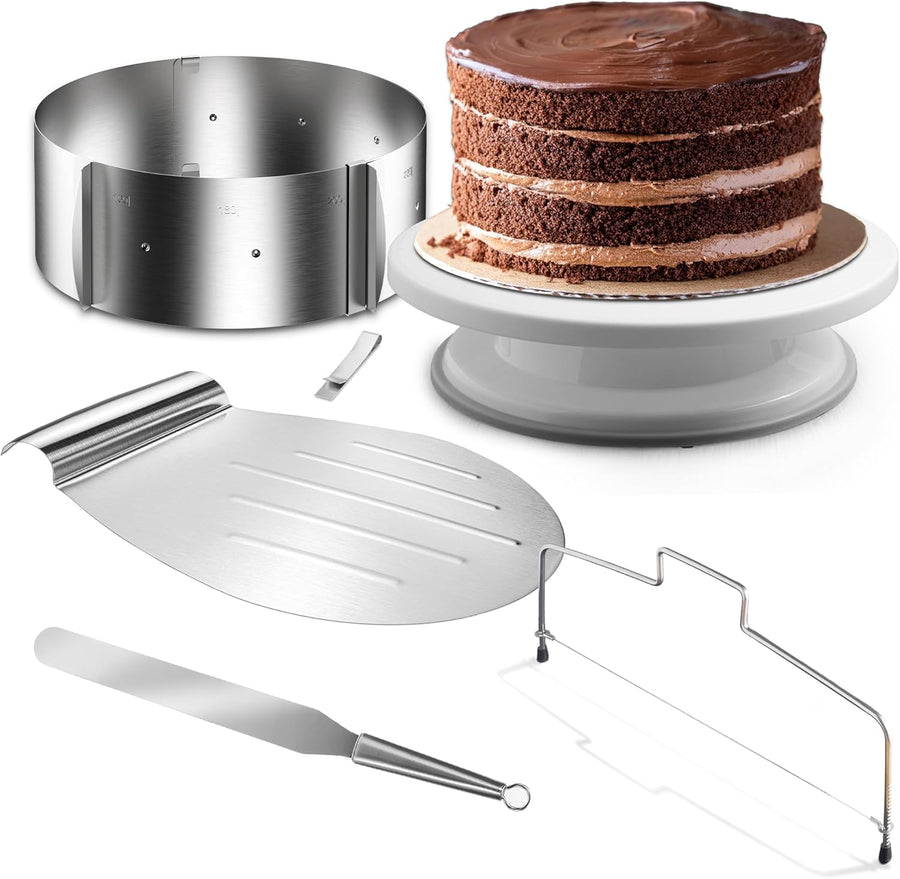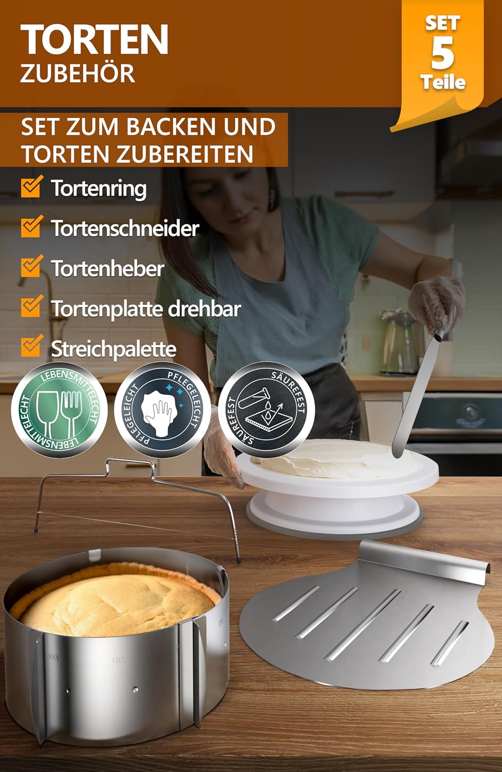 4smile Torten-Zubehör-Set – 4 Teile, Edelstahl - Tortenring verstellbar hoch 8,5cm + Tortenschneider