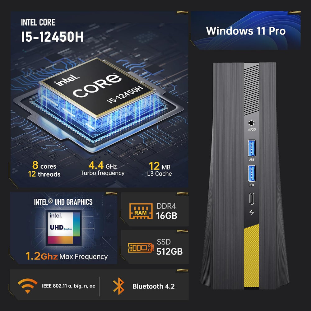 ACEMAGICIAN AD15 Mini PC, 12th Gen Intel 12450H (8C/12T, up to 4.4 GHz) 16GB DDR4 512GB NVME SSD Min