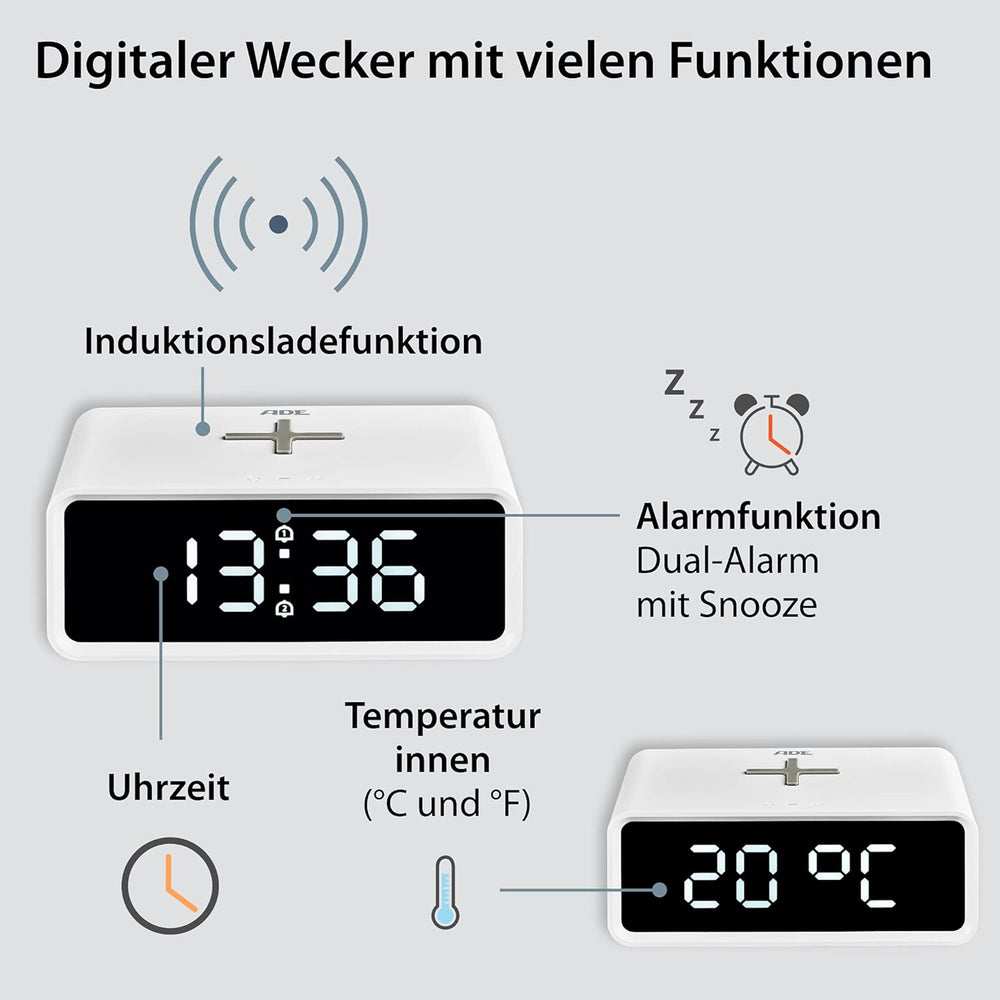 ADE CK2010 digitaler Wecker, kabelloses induktives Laden QI Smartphone 10W, mit Ladestation Wireless