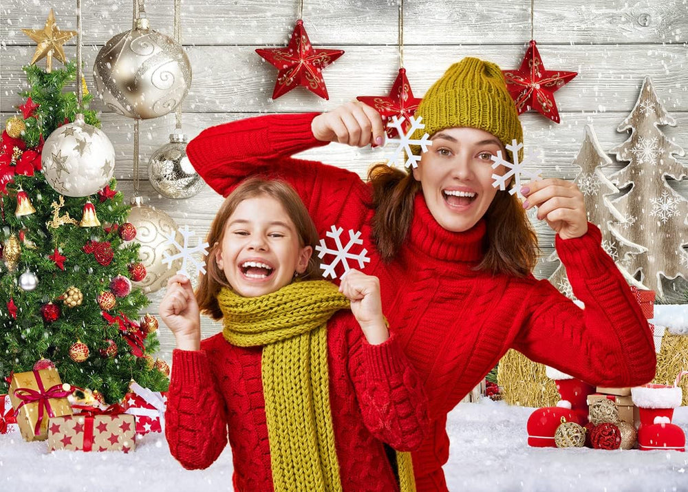 AIIKES 8x6FT Weihnachtshintergrund Weihnachtsbaum Geschenk Hintergrund Weiss Holzbrett Schneeflocke