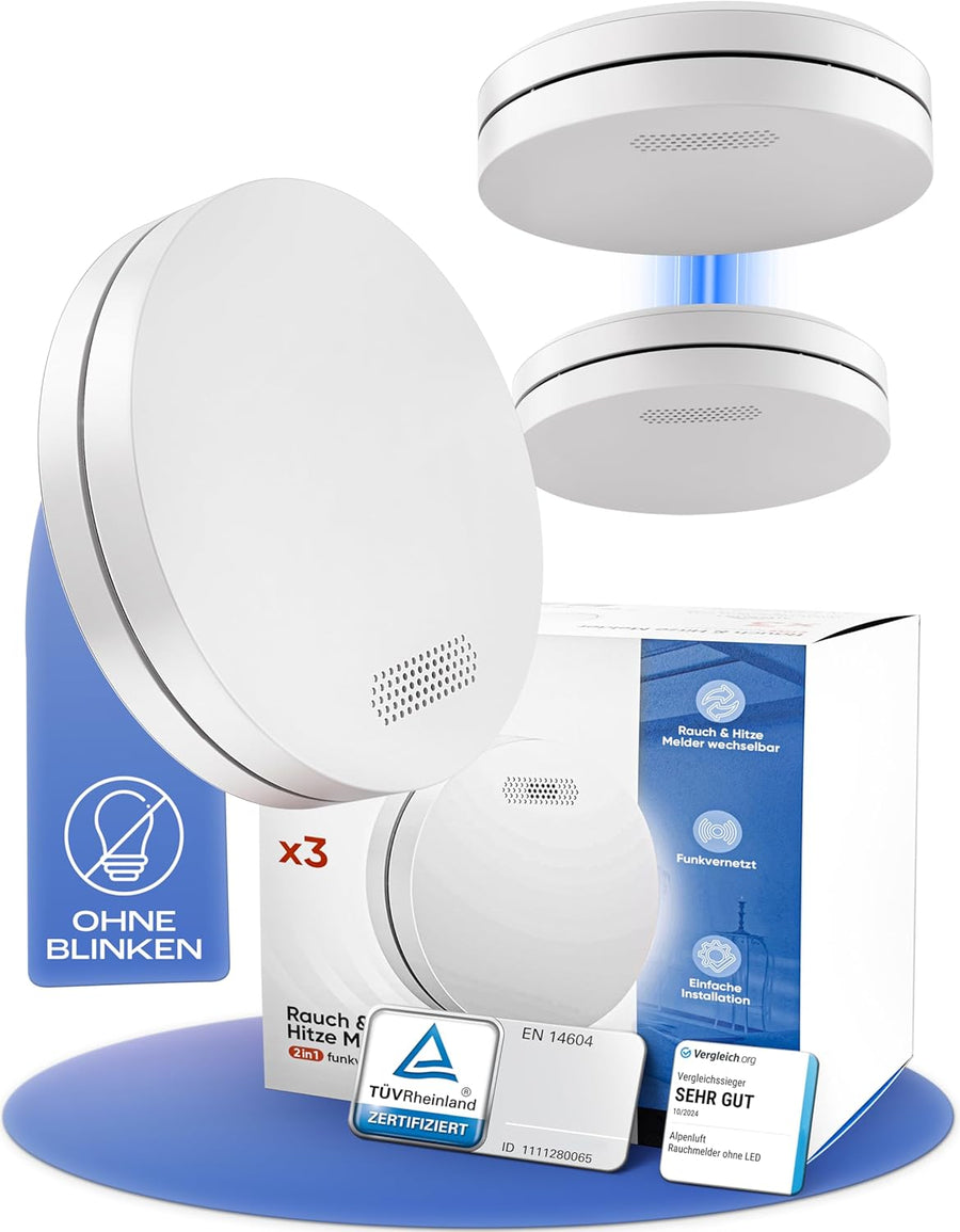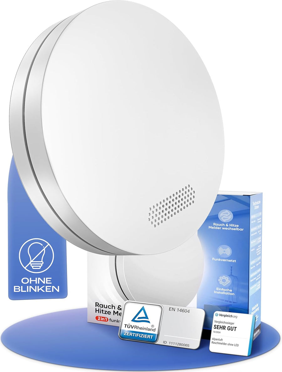 ALPENLUFT Rauchmelder Funk Vernetzt 10 Jahre Batterie, Rauchwarnmelder & Hitzemelder 2in1, Feuermeld
