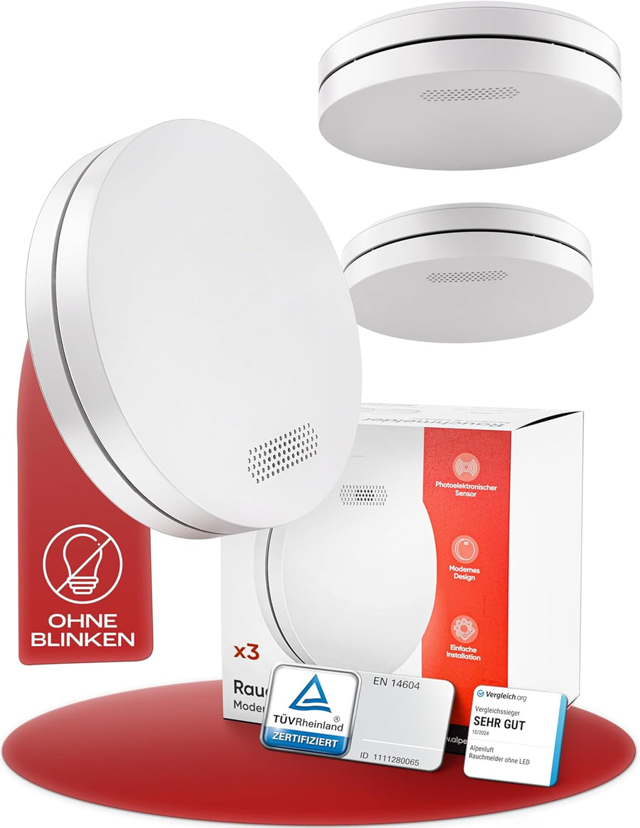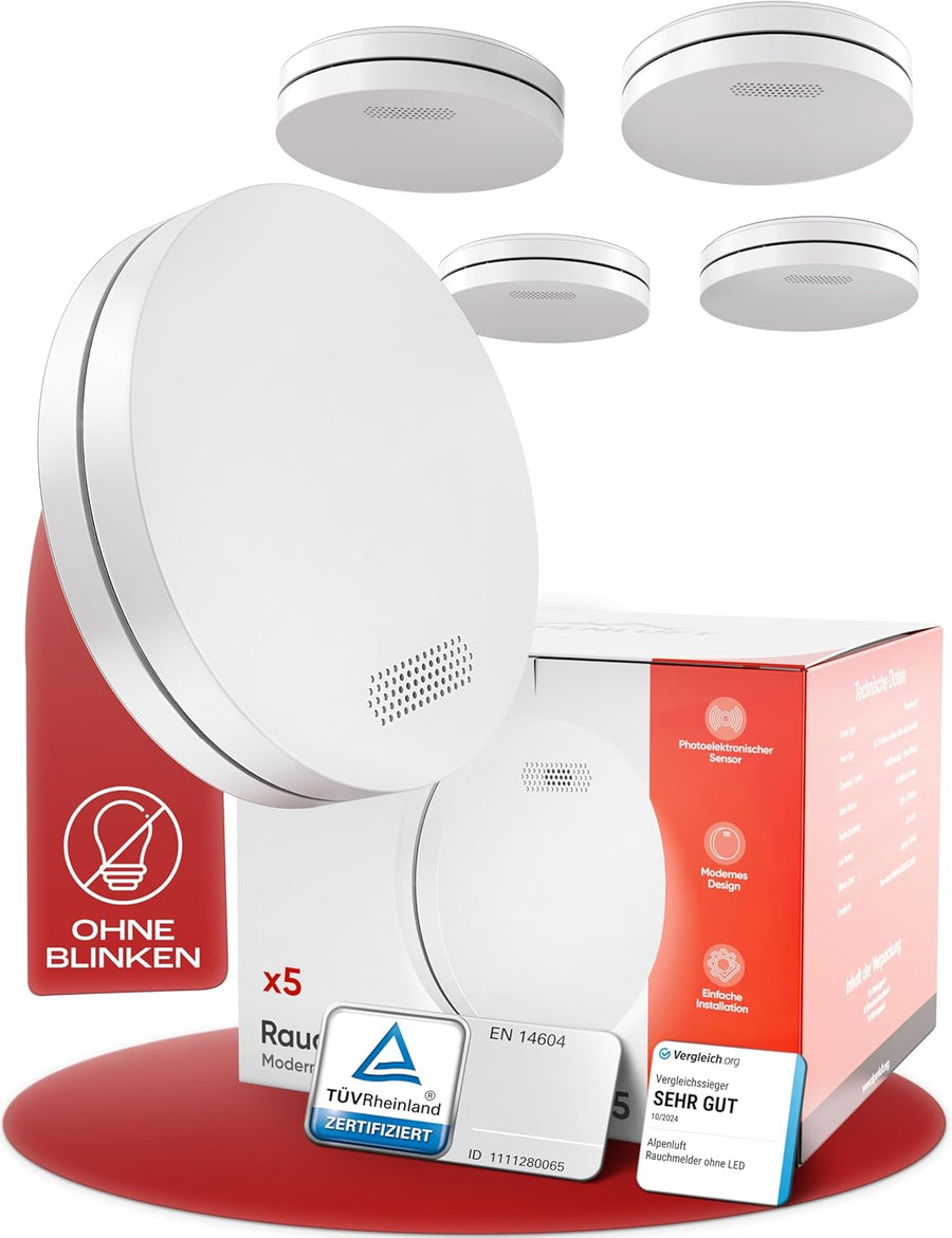 ALPENLUFT Rauchmelder 10 Jahre Batterie, Feuermelder Flach, Rauchwarnmelder, Brandmelder, | Ohne Boh
