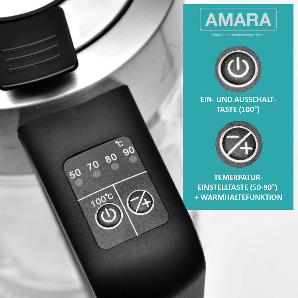 AMARA Wasserkocher Glas mit Temperatureinstellung 2200 Watt 2L besonders leise I Wasserkocher Temper