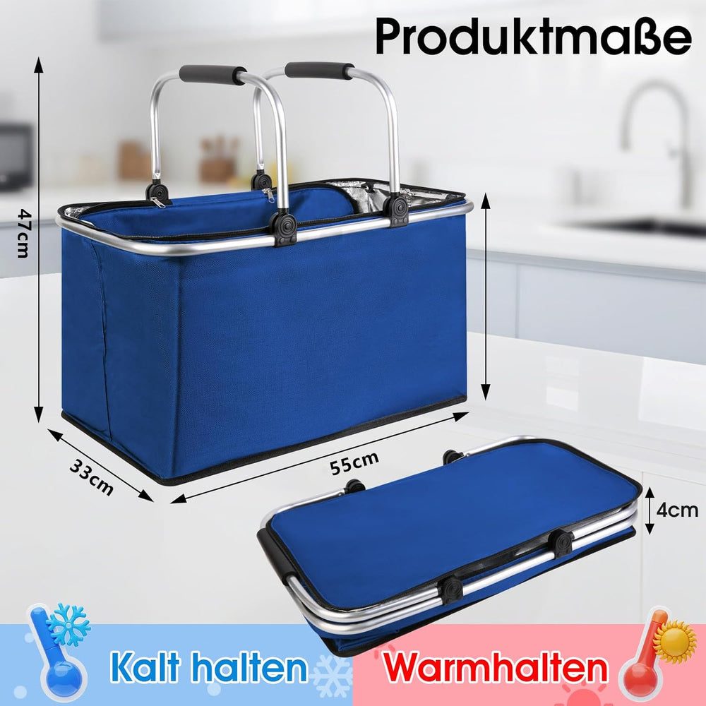kühlkorb einkaufskorb 47L,Mit Reissverschluss isolierter, Faltbarer Picknickkorb,Klapprahmen aus Alu