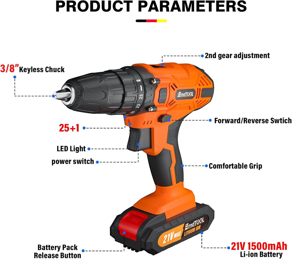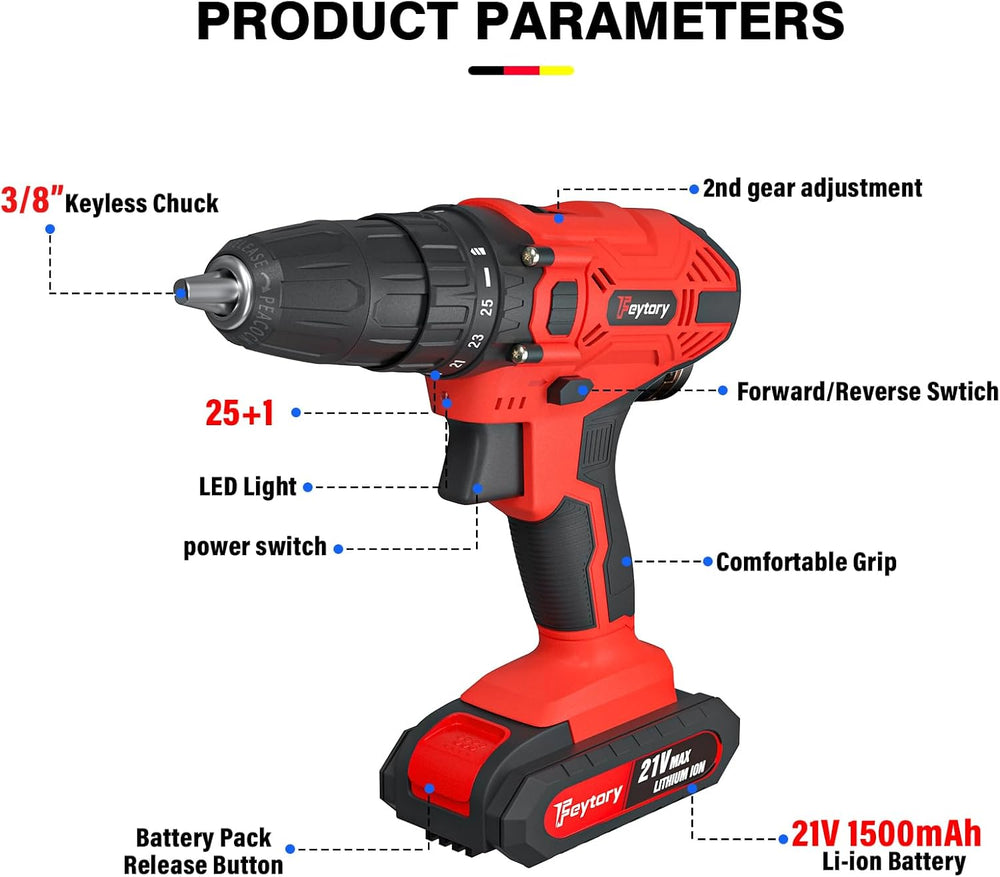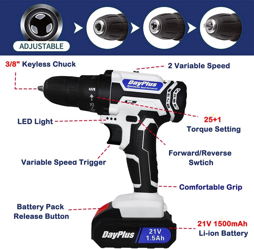 Akku Bohrmaschine 21V Akku Akkuschrauber Set mit 3/8'' Metallfutter, 25+1 Drehmomentstufen, LED-Lich
