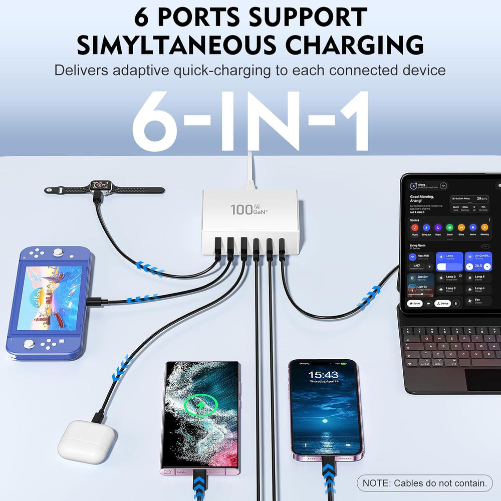 USB C Ladegerät, 100W 6-Port USB Ladegerät Mehrfach, Schnellladegerät PD 3.0, USB-C Ladestation für