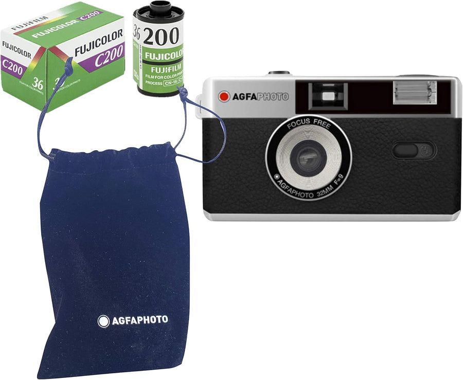 AgfaPhoto analoge 35mm Kleinbildfilm Foto Kamera schwarz + Farb Bilder Film + Batterie schwarz Set F