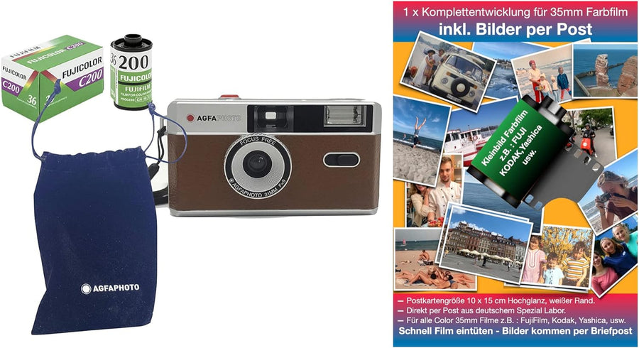 AgfaPhoto analoge 35mm Kleinbildfilm Foto Kamera braun + Farb Bilder Film + Batterie + KOMPLETTENTWI