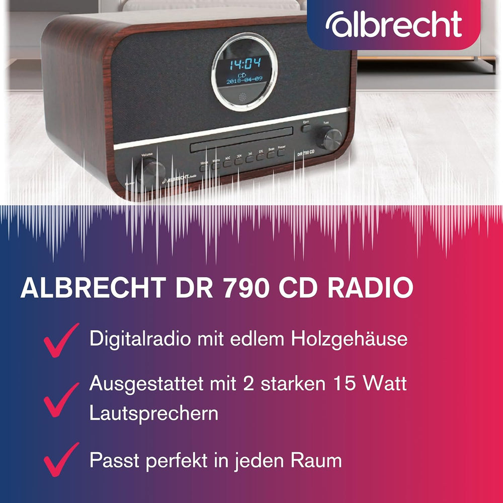 Albrecht DR790CD Digitalradio DAB+, 27790, multifunktional inkl. CD-Player und Bluetooth, Holzgehäus