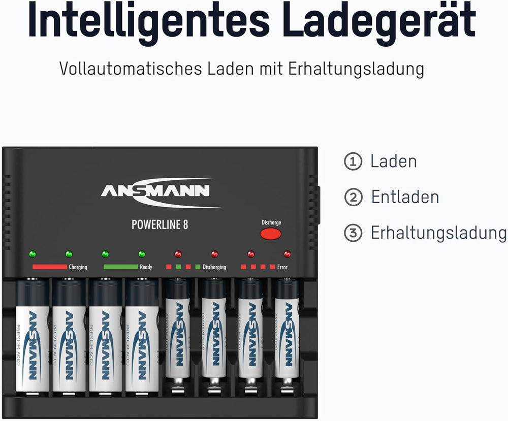 ANSMANN Akku-Ladegerät zum Laden & Entladen von 8X AA/AAA NiMH Akkus - 8-Fach Batterieladegerät mit