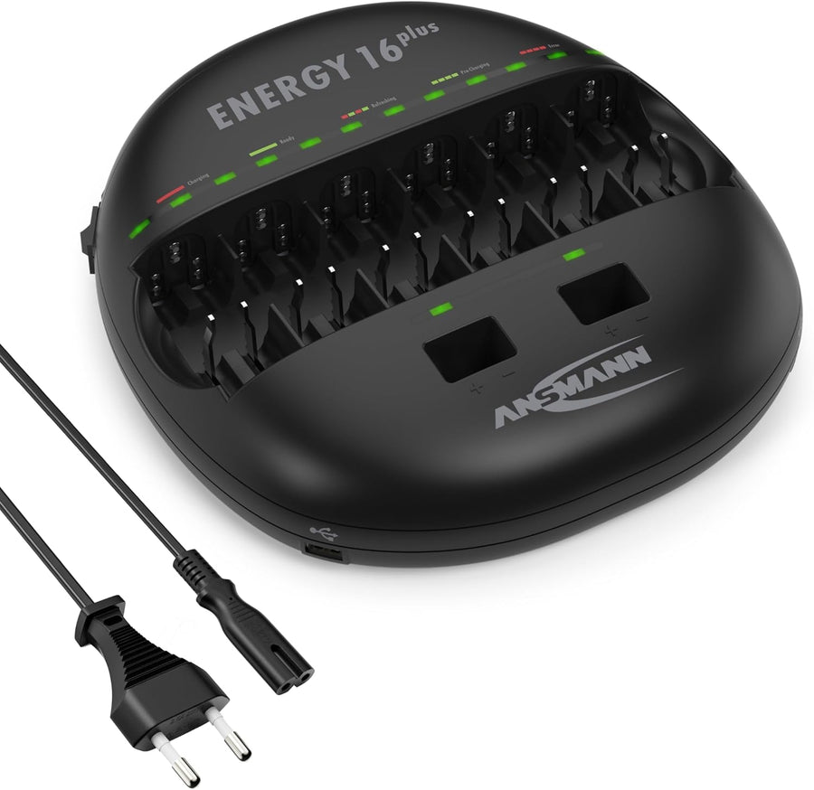 ANSMANN Energy 16 Plus Akku Ladegerät - Ladestation für AAA, AA, C, D, 9V E-Block & USB - Schnelllad