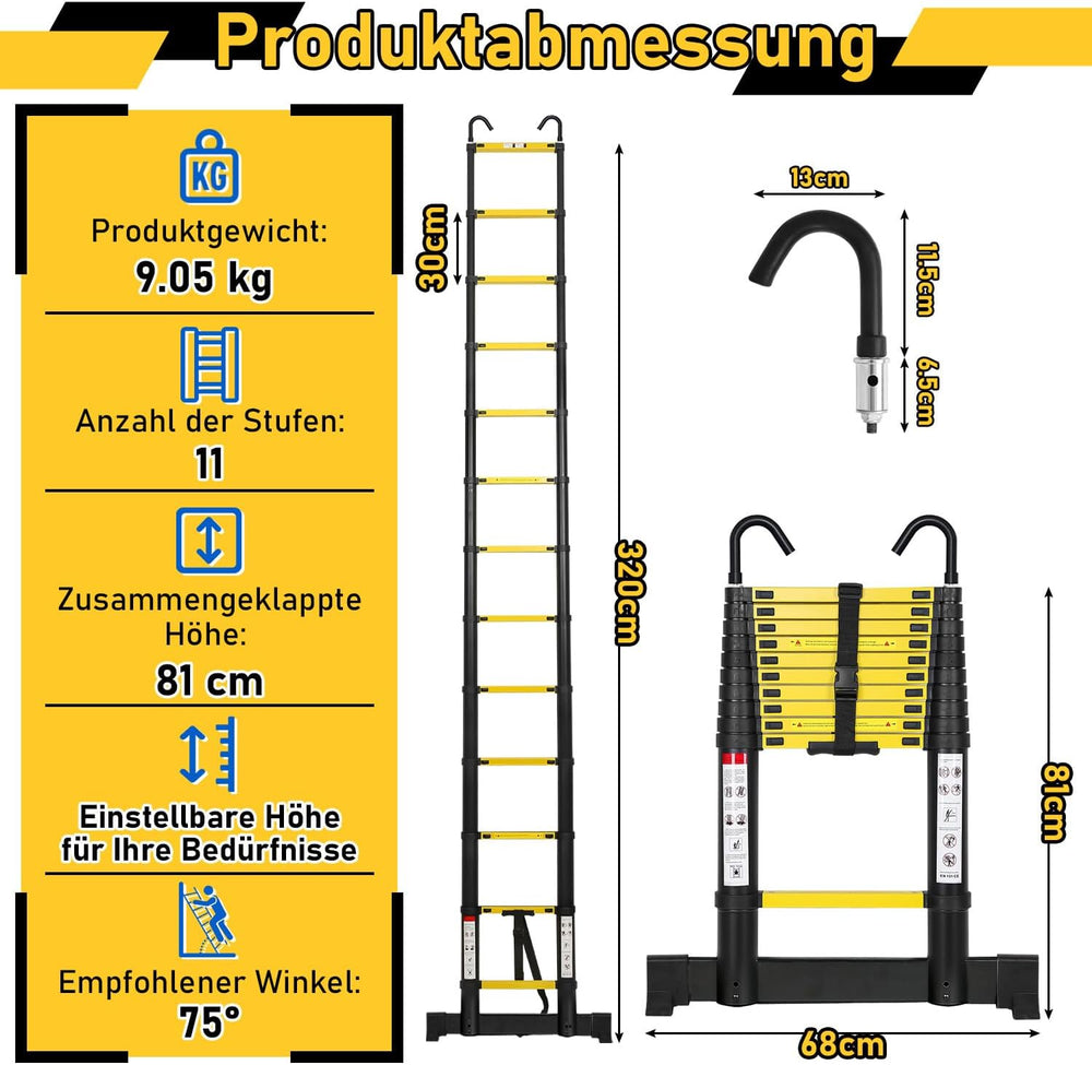Ansobea 3.2M Klappleiter Teleskopleiter für treppe Rutschfester Multifunktionsleiter Schiebeleiter A
