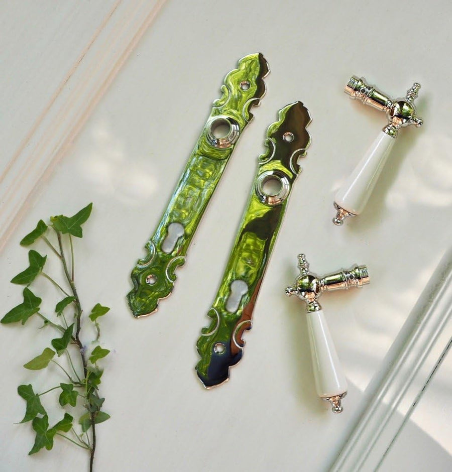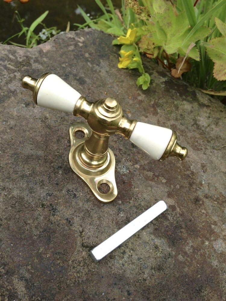 Antikas - Fensterolive aus Messing poliert, Porzellan, Gründerzeit Fenstergriffe