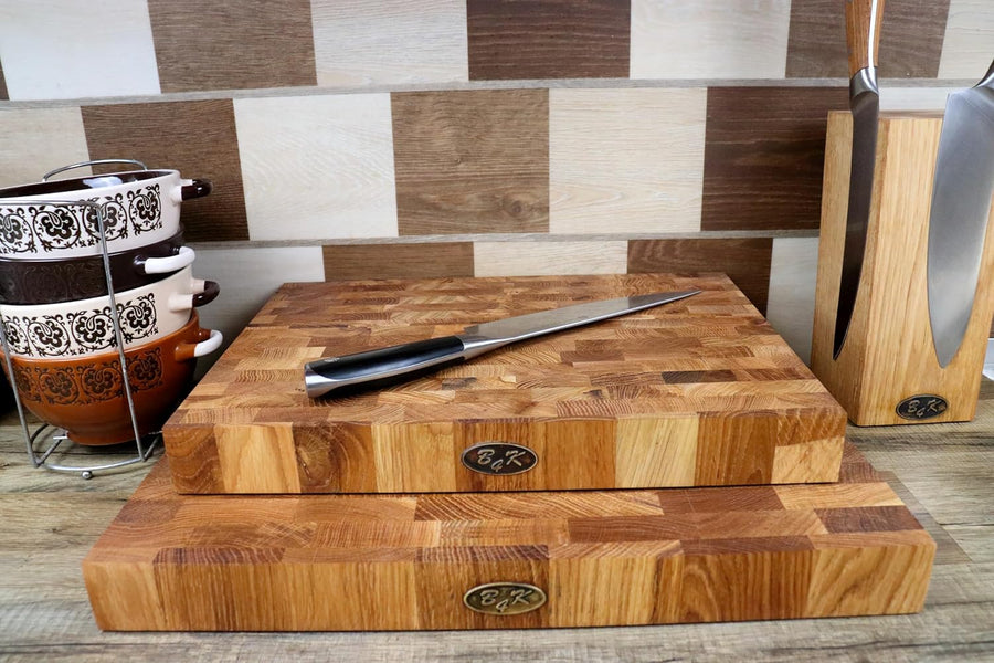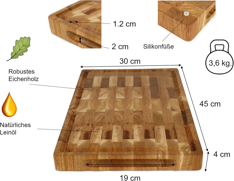 B4K® 45х30х4cm Küchenbrett aus Eiche Stirnholz | Antibakterielles Hirnholzbrett mit Griffen, Silikon