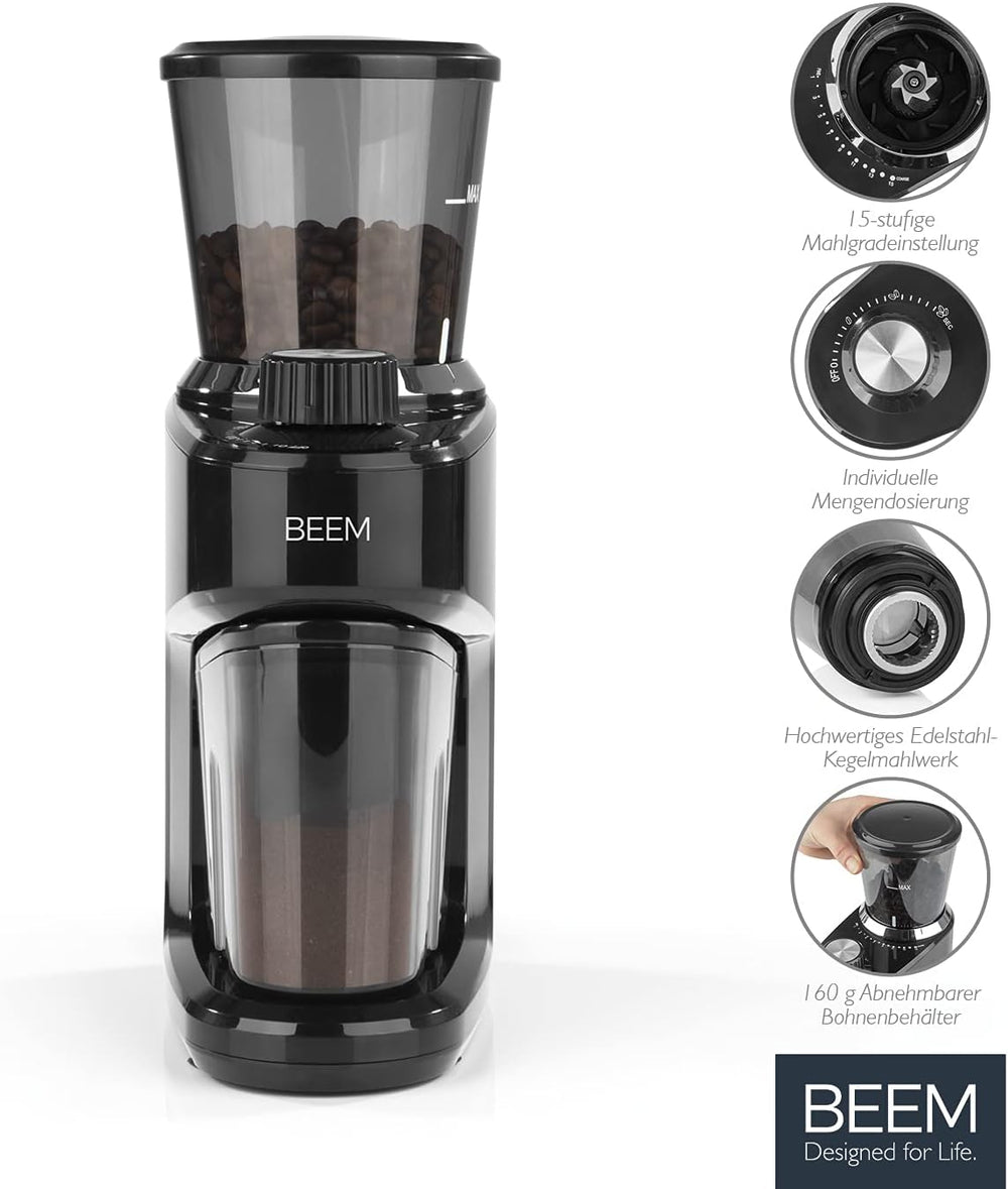 BEEM 3980 GRIND-INTENSE Elektrische Kaffeemühle - 160 g | Edelstahl-Kegelmahlwerk | 15-stufige Mahlg