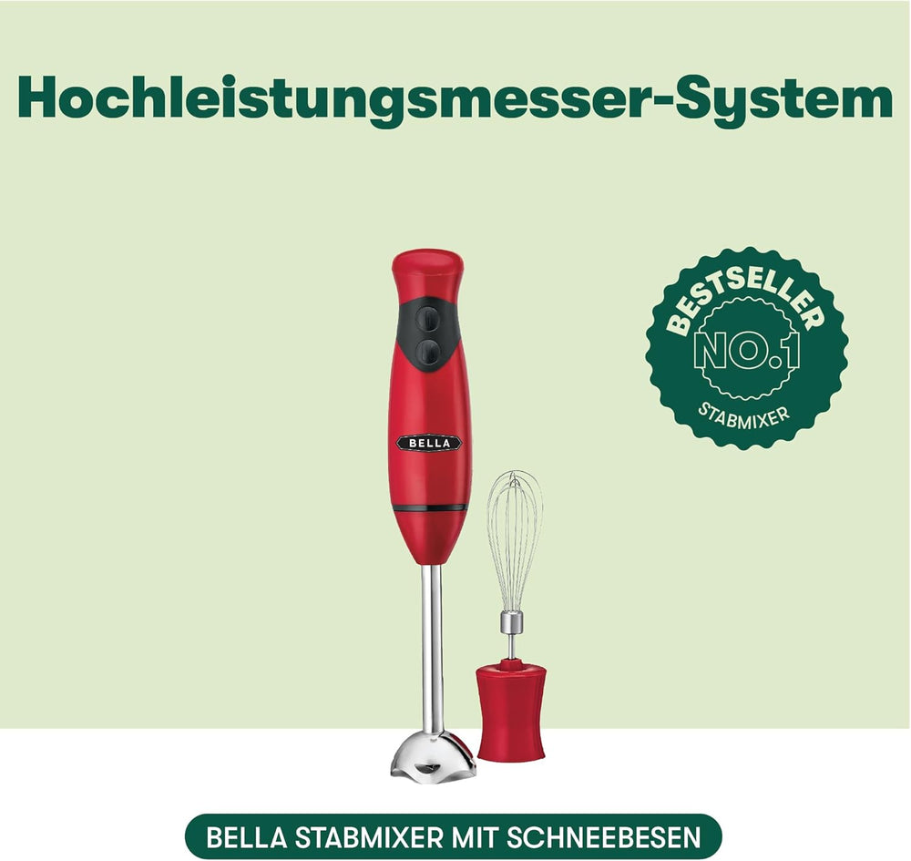 BELLA Stabmixer mit Schneebesenaufsatz, schnelles Mixen von Saucen, Pürieren von Suppen, Smoothies &