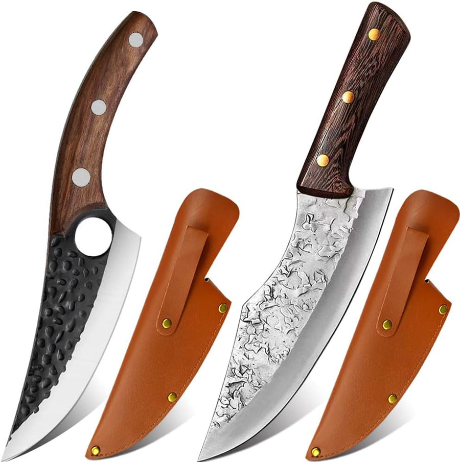 2 Stücke Kochmesser, Küchenmesser mit Lederscheide - Handgeschmiedet Chefmesser,Perfekt zum Schneide