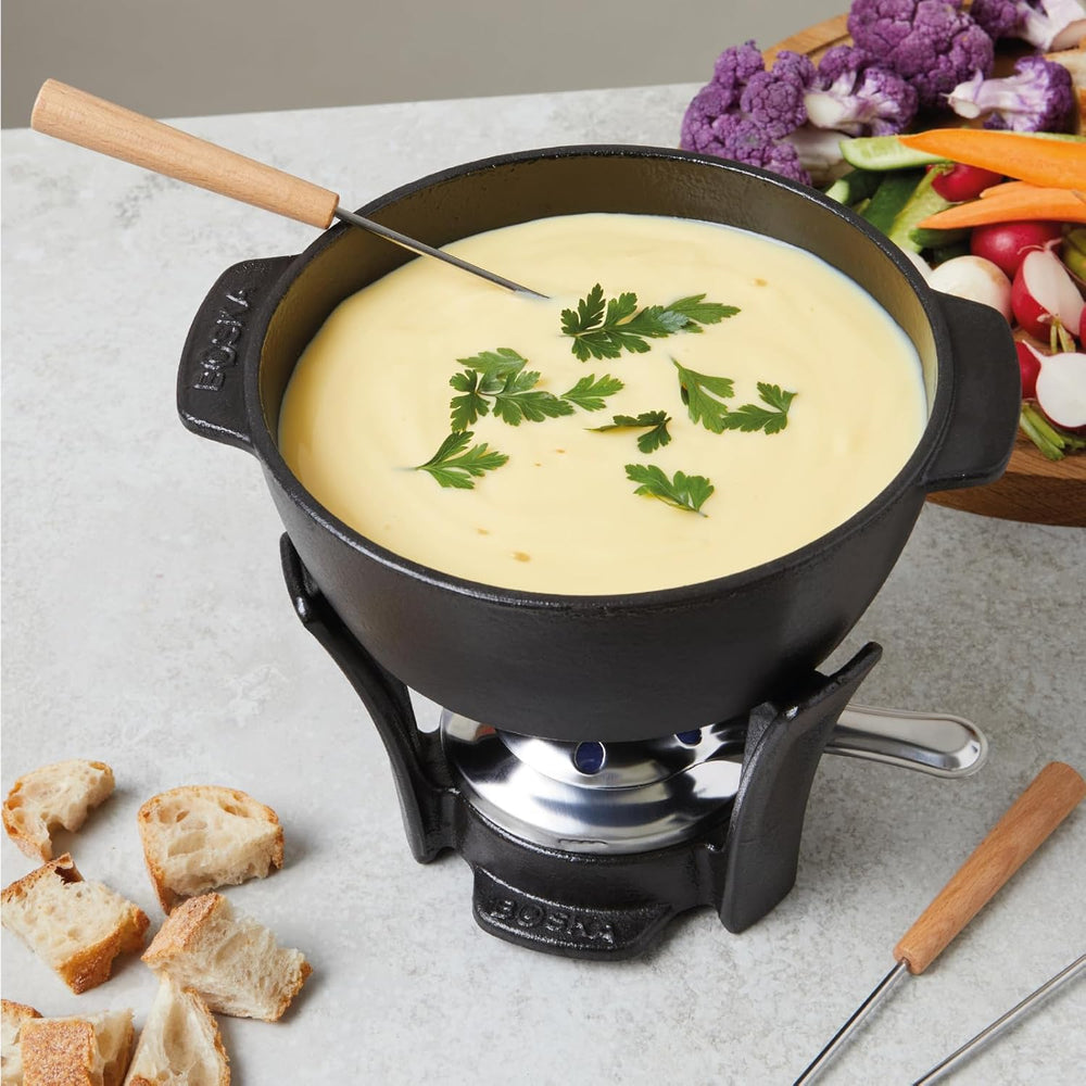 Boska Fondue-Set Pro, für 1 Liter Fonduekäse, 310x212x170 mm Schwarzes Gusseisen mit Holzsockel, Sch