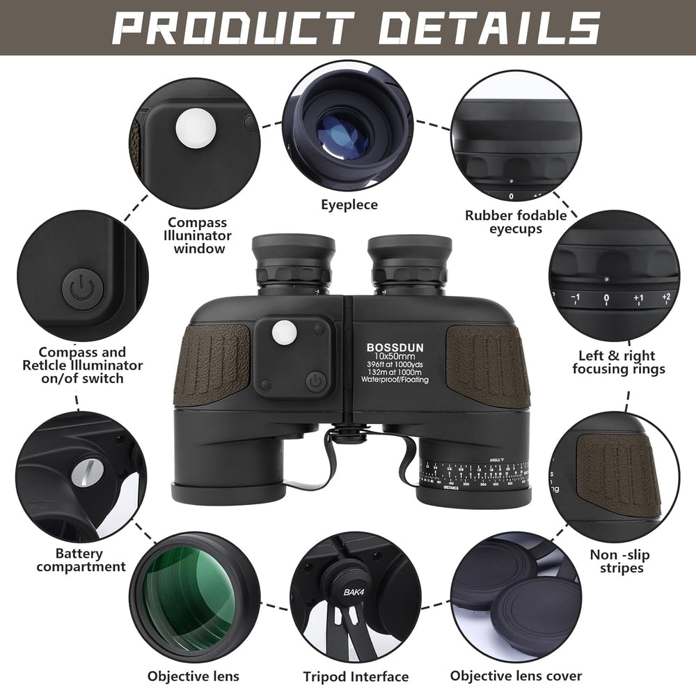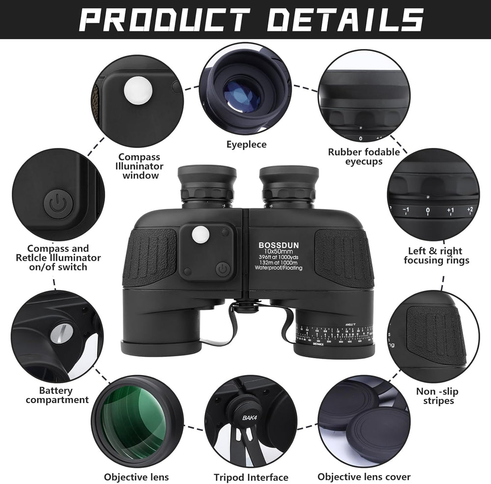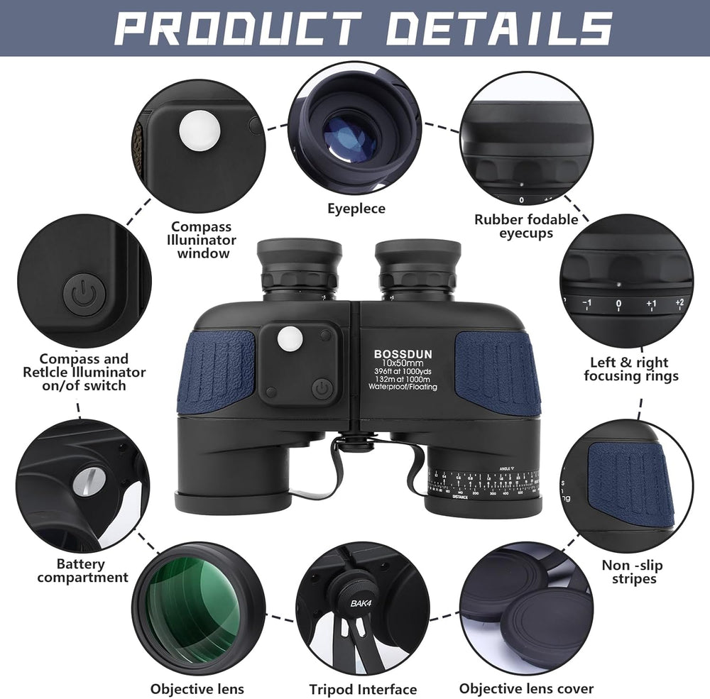 BOSSDUN 10x50 Marine Fernglas,Fernglas mit Nachtsicht Entfernungsmesser und Kompass, für Wassersport