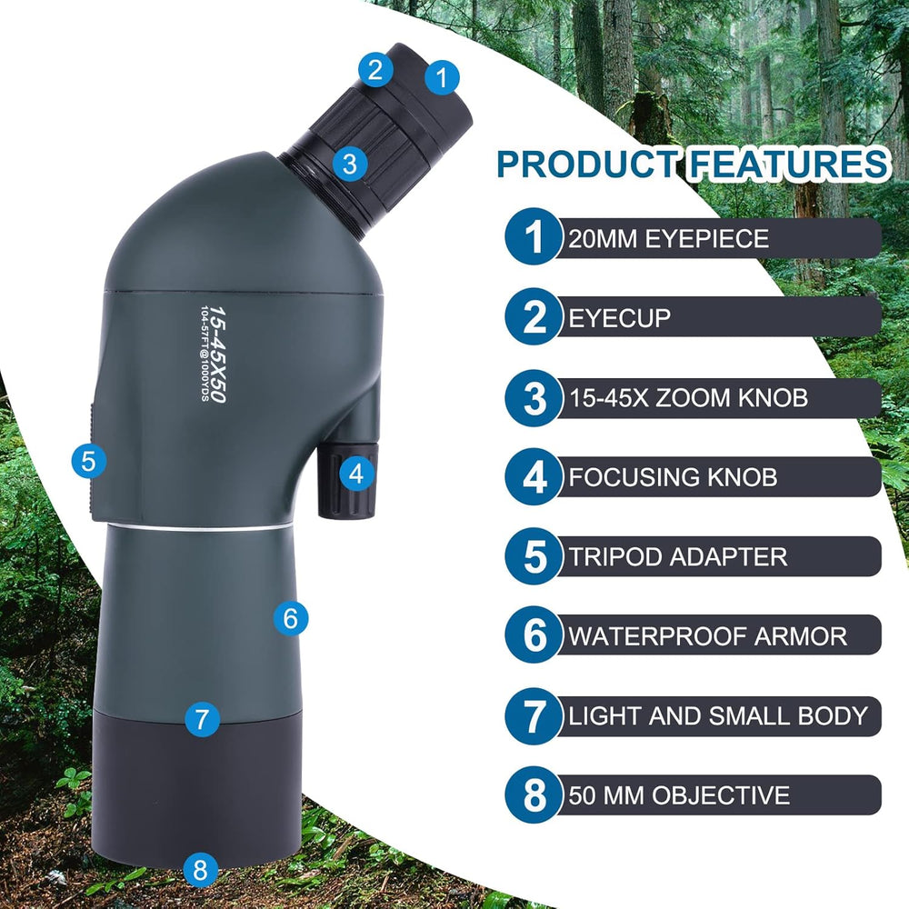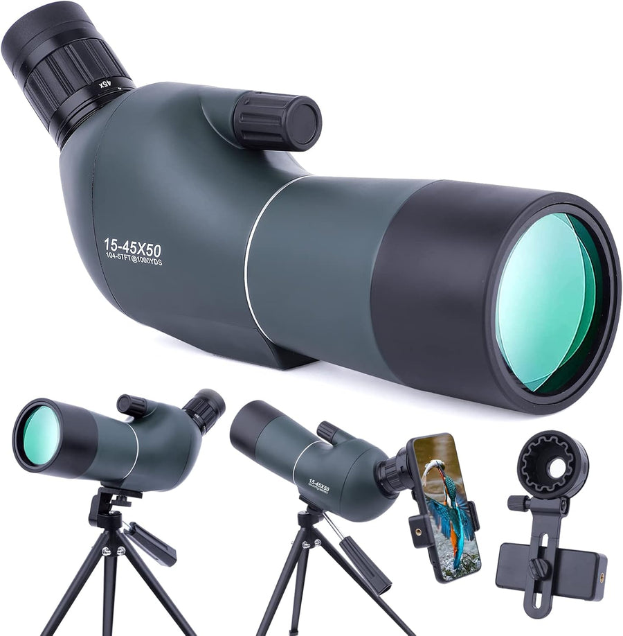 Spektiv 15-45x50, HD Wasserdichtes Spektiv mit Stativ, Tragetasche und Smartphone-Adapter für Vogelb
