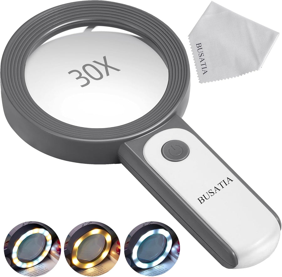 BUSATIA Lupe mit 18 Led Licht, 30X Handlupe Leselupe mit 3 Beleuchtungsmodi, Vergrösserungsglas zum