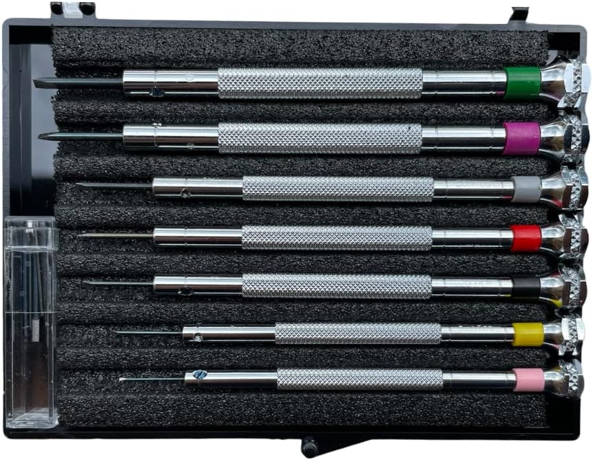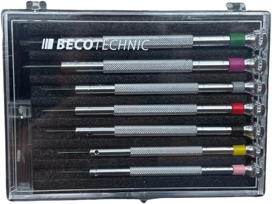 BUZZUFY Beco Technic 7 Stück Schraubendreher 0,60 bis 2,00 mm in Kunststoffbox mit Ersatzklingen Uhr
