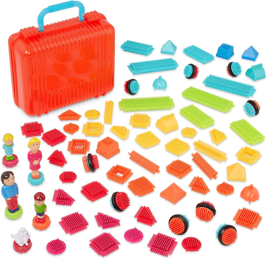 Bristle Blocks 85 Teile Bausteine im Koffer mit Figuren – Bauklötze mit Borsten, Motorikspielzeug –