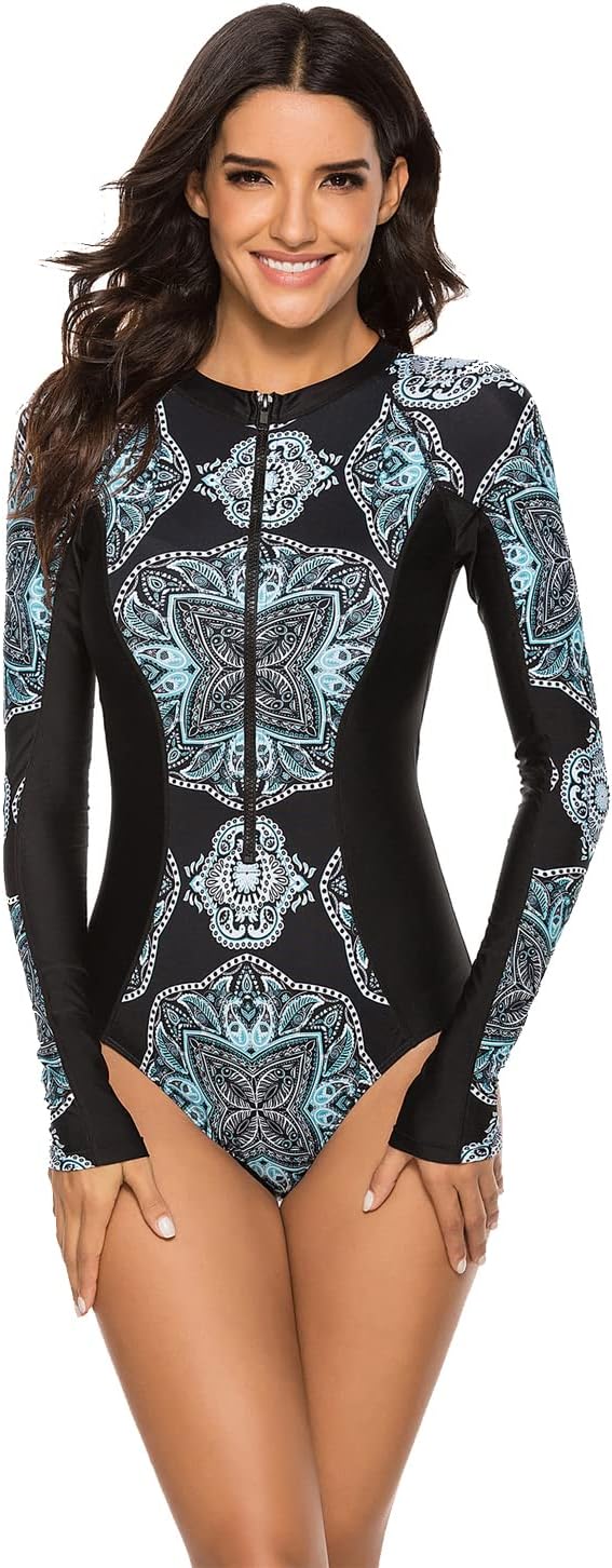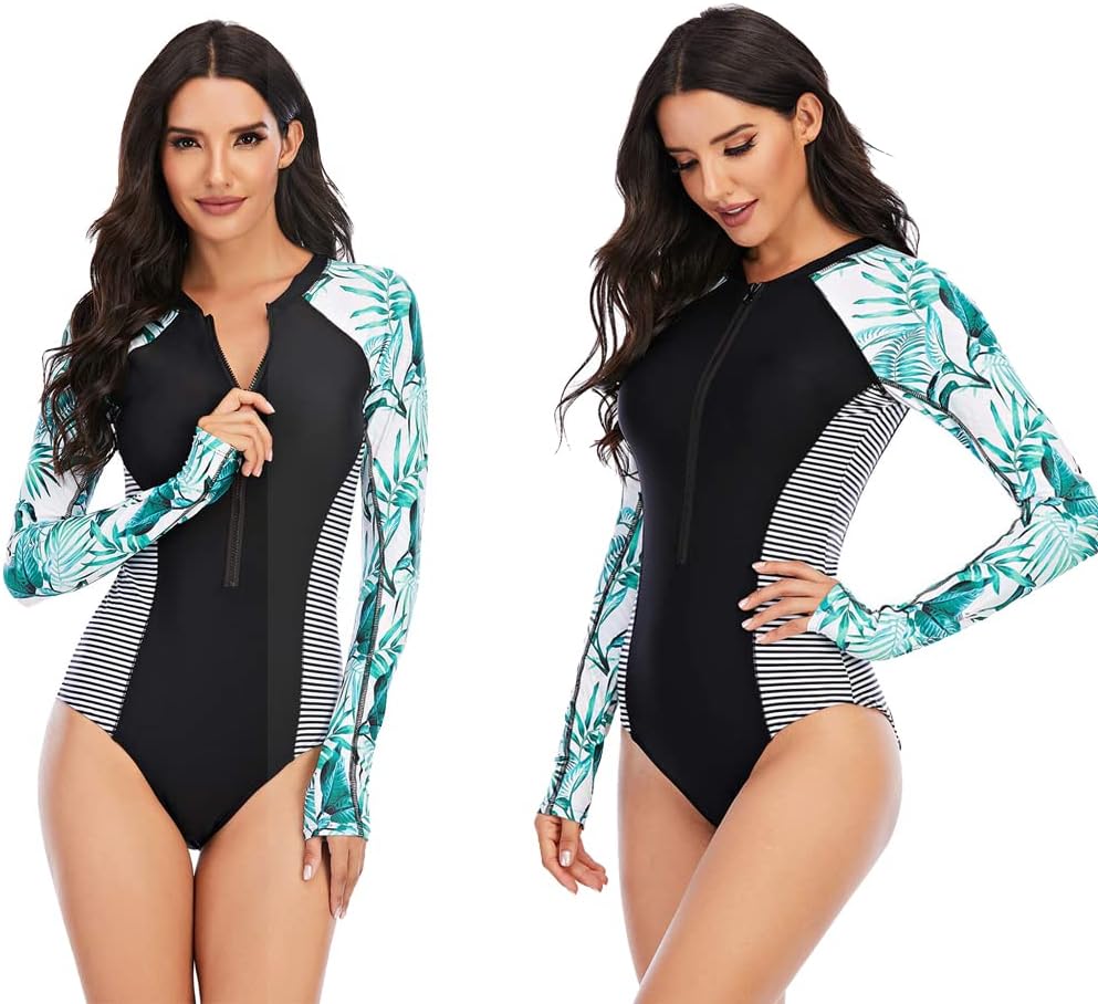 Beachkini Moderner Atmungsaktiver Damen-Badeanzug mit Langarm,Bedruckte und Einfarbige Badeanzüge fü
