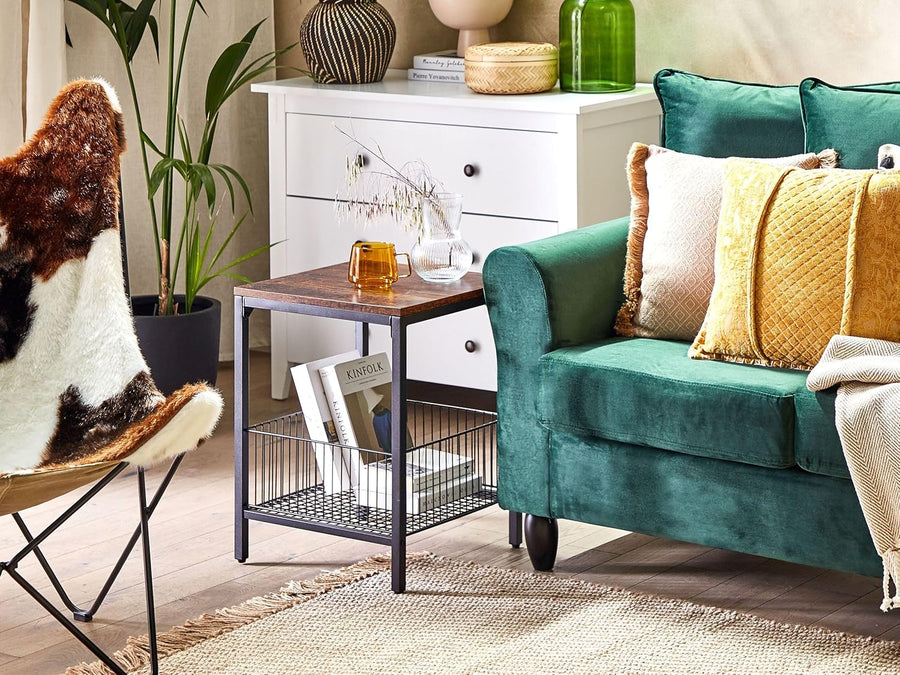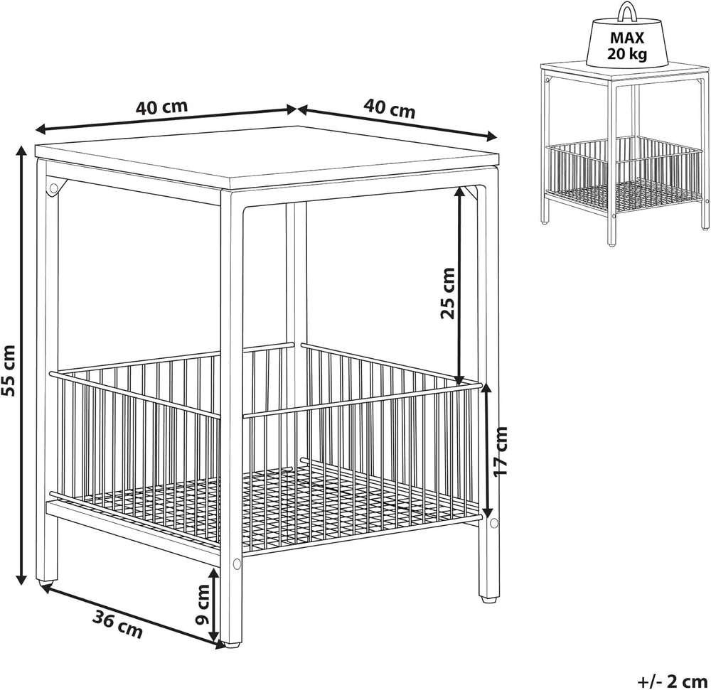 Beistelltisch dunkler Holzfarbton / schwarz Metallbeine mit Drahtkorb Bruni