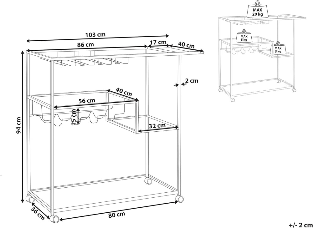 Beliani Servierwagen Glasplatte schwarz mit Rollen Flaschenhalter Gläserhalter Marcola
