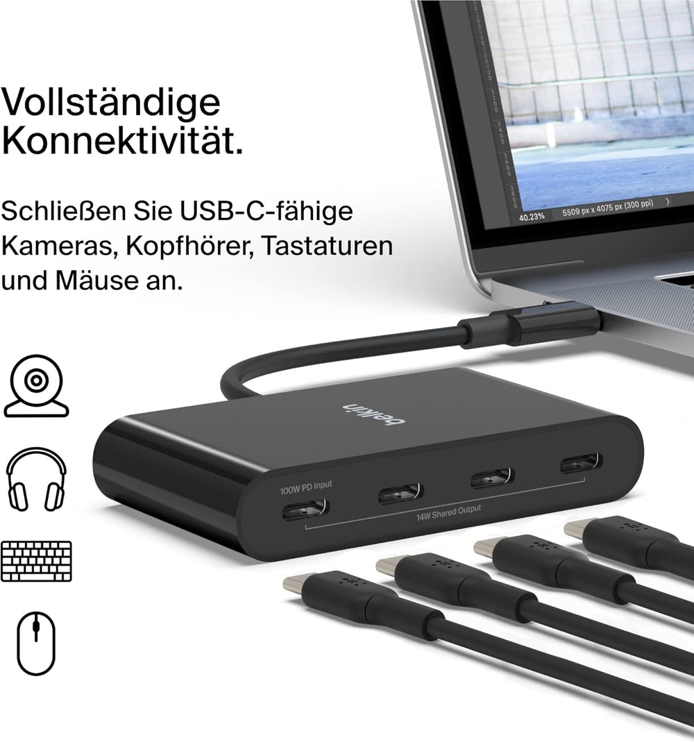 Belkin Connect USB-C auf 4-Port USB-C-Hub, Multiport-Adapter Dongle, 4 3.2-Ports der 2. Gen, 100 W P