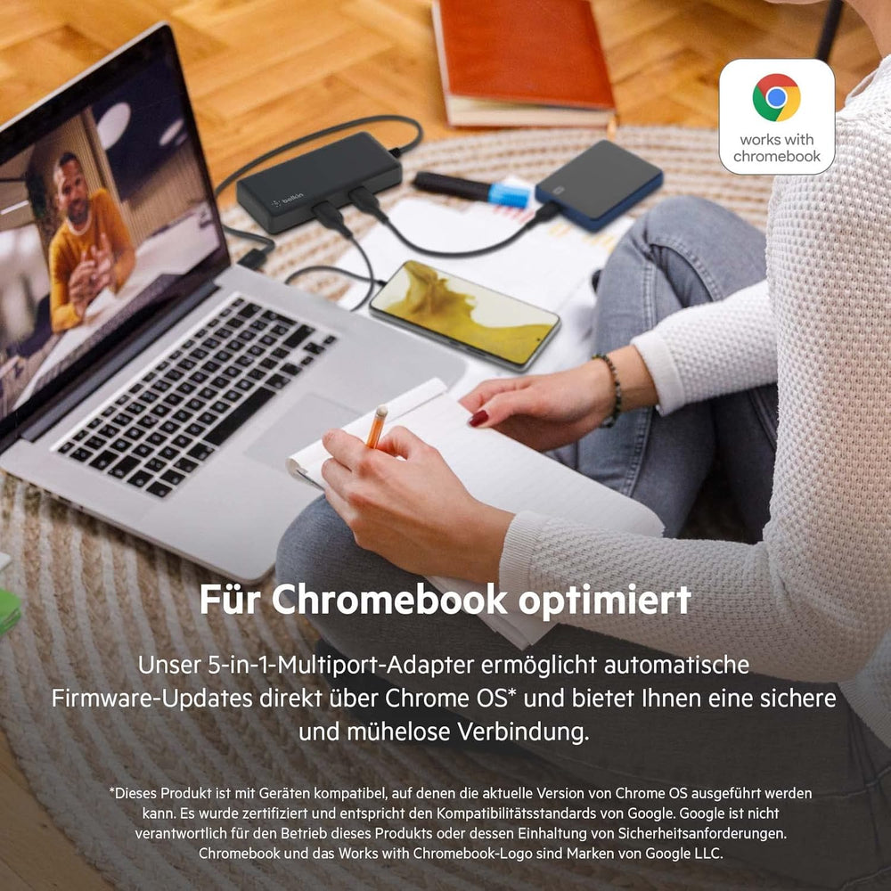 Belkin 5-in-1 Multiport-Hub-Adapter, optimiert für Chromebook mit 4K bei 60 HZ, HDMI-Port, USB-C, 86