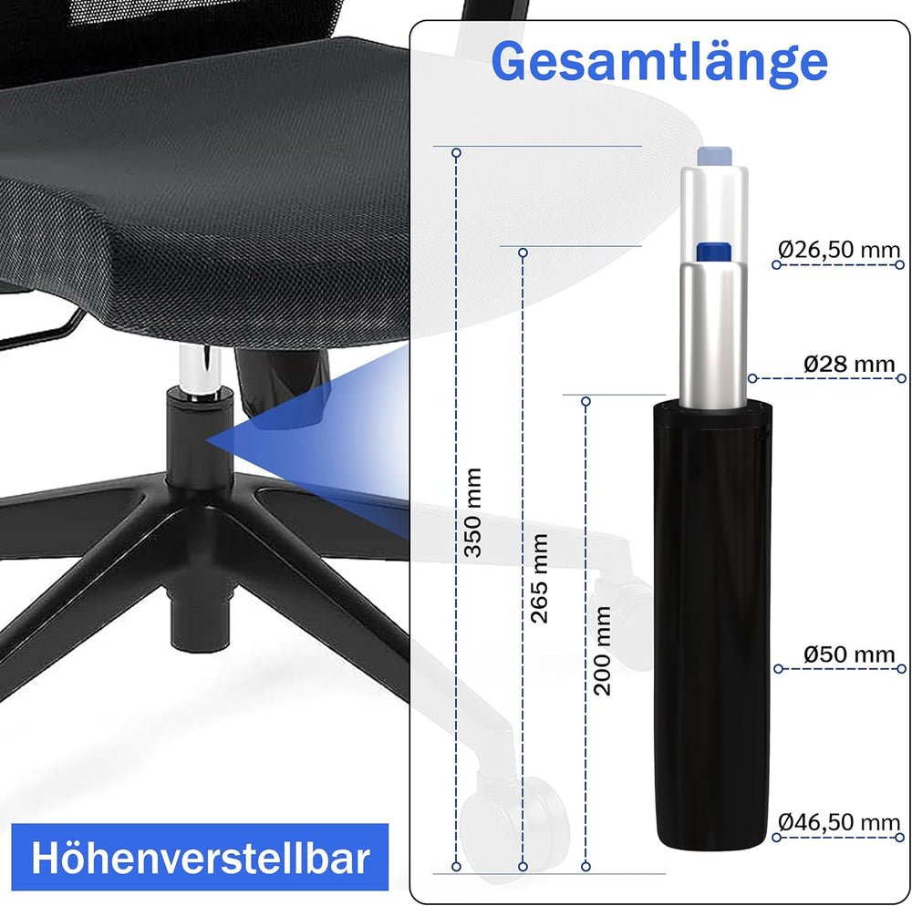 Bemacom Gasdruckfeder für Bürostuhl bis 200kg Belastbarkeit, Länge 350mm Schwarz Ersatz Gasdruckfede