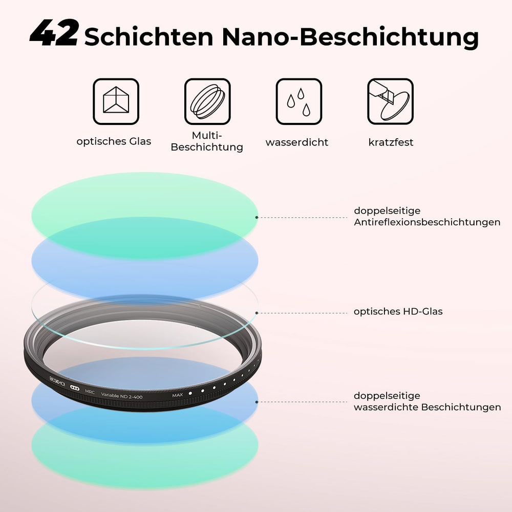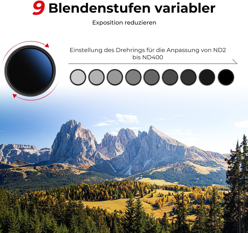 Beschoi 49mm Variable ND Filter ND2-ND400 (1-9 Stufe) mit 42-Mehrfacher Beschichtung wasserfest Krat