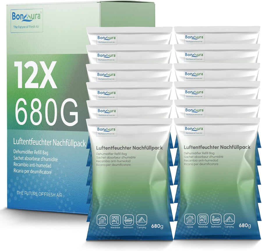 BonAura® AirOne Luftentfeuchter Nachfüllpack I 12er Set 680g Luftentfeuchter Granulat I Entfeuchter