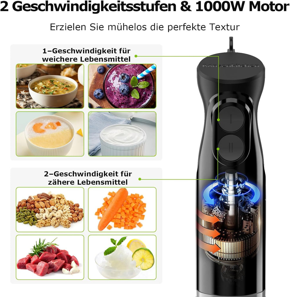 Bonsenkitchen Pürierstab, 4-en-1 Stabmixer Elektrischer, 1000W Stufenlos Geschwindigkeiten Püriersta