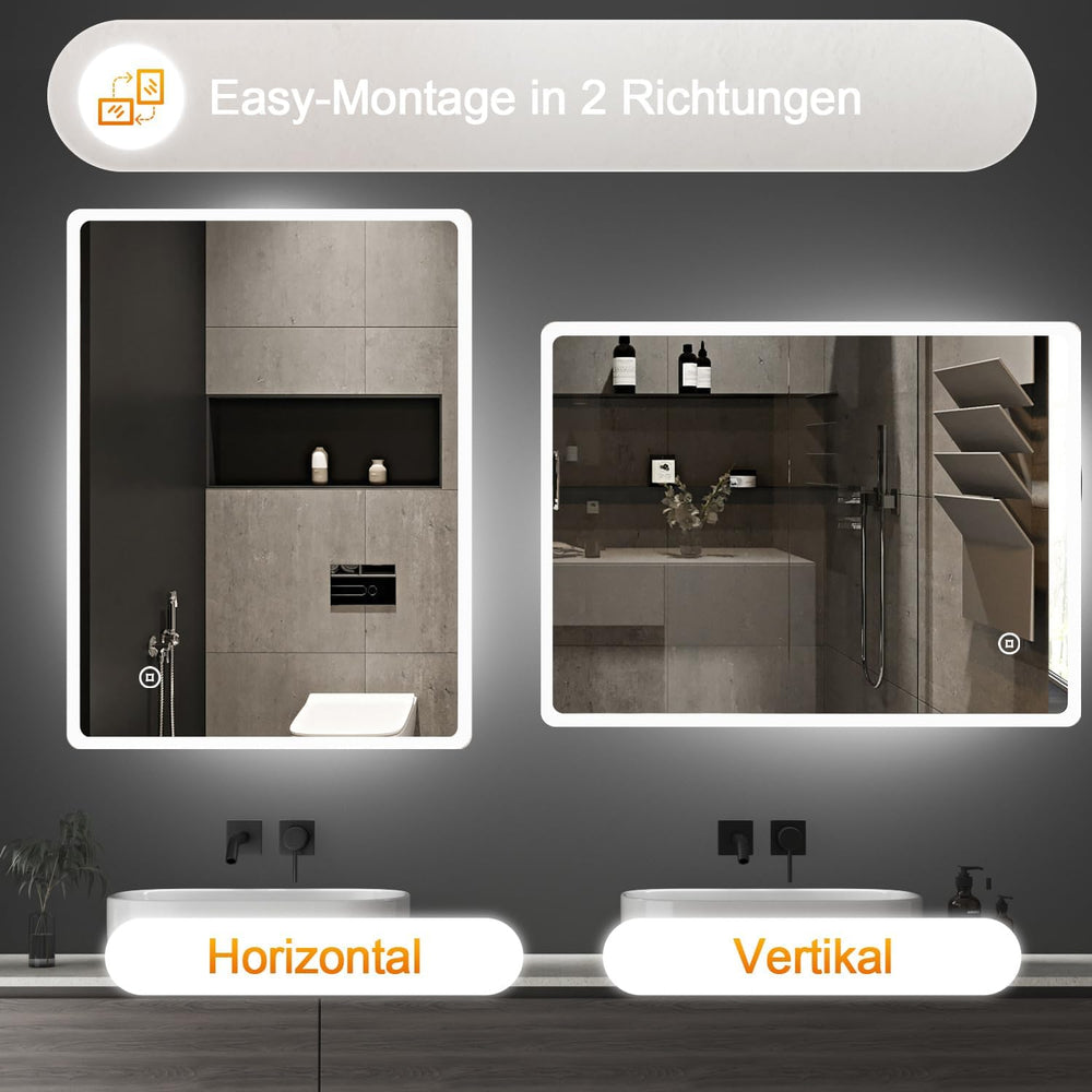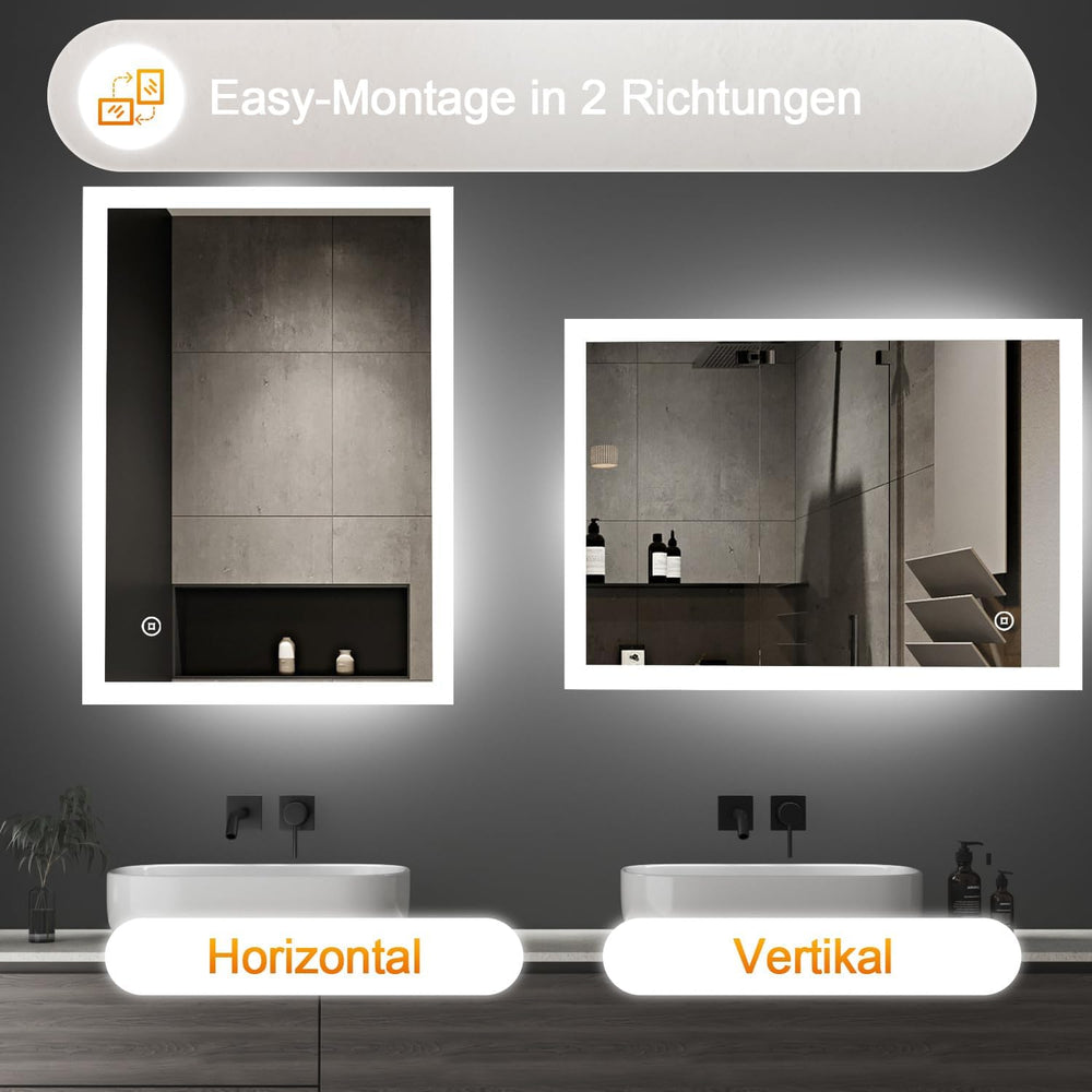 Boromal Badspiegel mit Beleuchtung 60x40cm Wandschalter Badezimmerspiegel Horizontal/Vertikal 6500K
