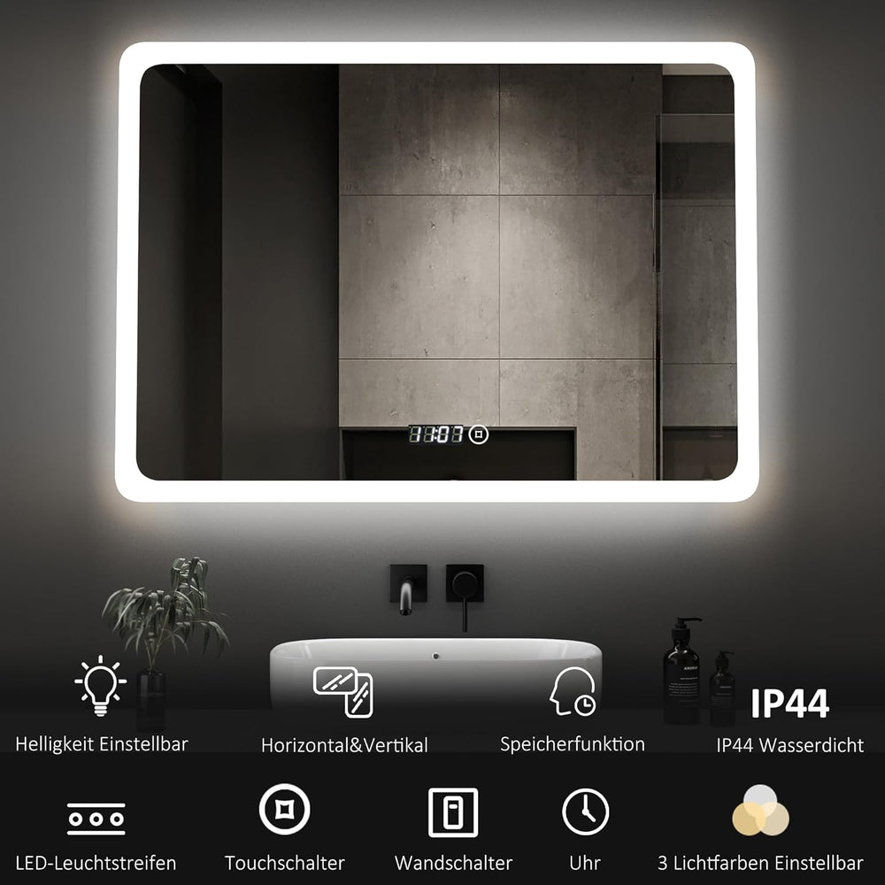 Boromal Badspiegel mit Beleuchtung 80x60cm Badezimmerspiegel 3 Lichtfarbe Dimmbar 3000-6500K 2880LM